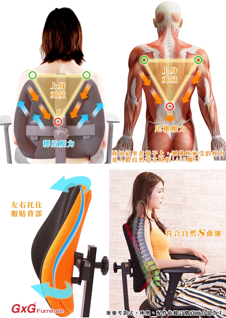 一般的電腦椅,實際上『椅背』大都不能支撐人體腰椎,緣自於人體本身的構造,人體的肩胛骨兩旁延伸至肩膀,其雙肩的壓力,會集中到腰椎中心處形成一個『倒三角的點』,如同一個箭頭向下將壓力壓迫到腰椎,無法讓脊椎肌肉正常釋放重力。 GXG Furniture開發出新式『智慧雙背椅』,提倡健康座、舒適生活,當您坐在一般椅子上,腰椎基本所承受的壓力,是人體自然站立時的140%,而使用『雙背智慧椅』,如同多了一雙手,完整托住您的背部,明顯比一般椅子減輕百分之五十的腰椎壓力,讓腰椎壓力降至75%,改善您長久以來的困擾怎麼坐,都痠痛的問題,能讓您舒適度明顯提升