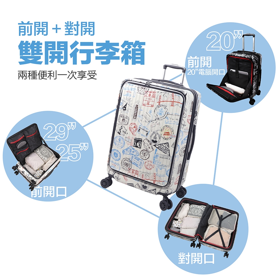 ●創新結合前開+對開兩種模式的行李箱,完美兼具兩種行李箱的優點。
