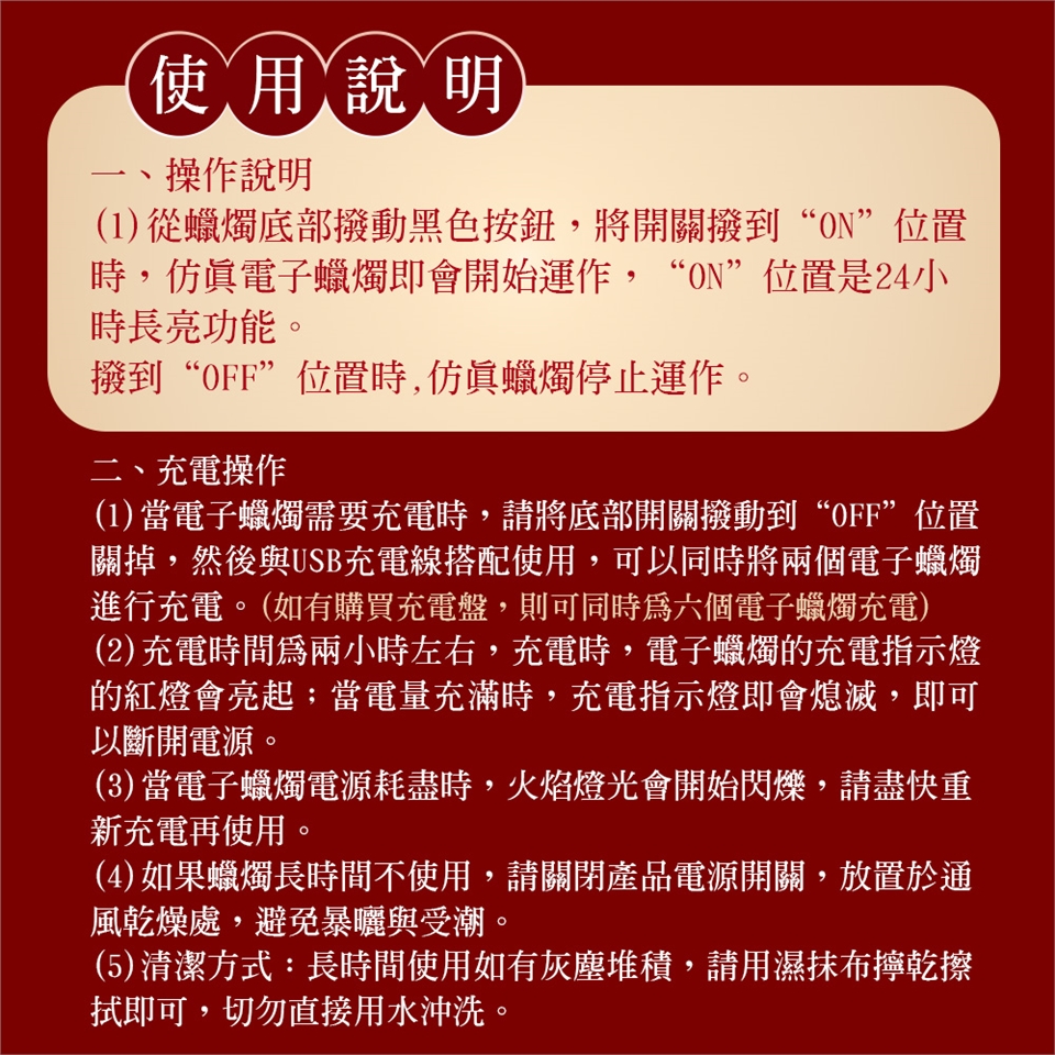 (3)當電子蠟燭電源耗盡時,火焰燈光會開始閃爍,請盡快重新充電再使用。