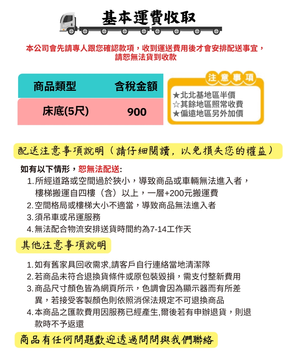 ※本賣場商品運費以單一件商品計算不可合併,例如單張訂單2件商品,則運費以2件計算。