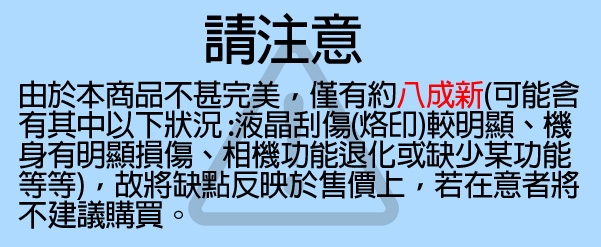 福利品商品並非全新機,本品由於品項不甚完美,僅有約八成新,故將缺點反映於售價上,若在意手機外觀者將不建議購買此品,商品皆為功能正常之良品,可能有些微刮傷,但不影響功能,且出貨前都已重新整理和包裝。規格以原廠文案為主,配件內容也有小變動,不參與任何原廠活動,請勿以全新機觀念購買,確定購買後如遇維修,保固期內均由供應商代送原廠或維修站,請勿自行送修以免爭議。確定拆機後會取消供應商保固,福利品可能進行維修更換零組件過,購買前請先詳讀購前須知後不介意者再再進行下訂。