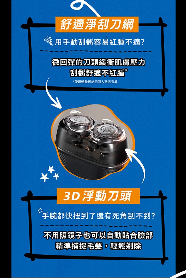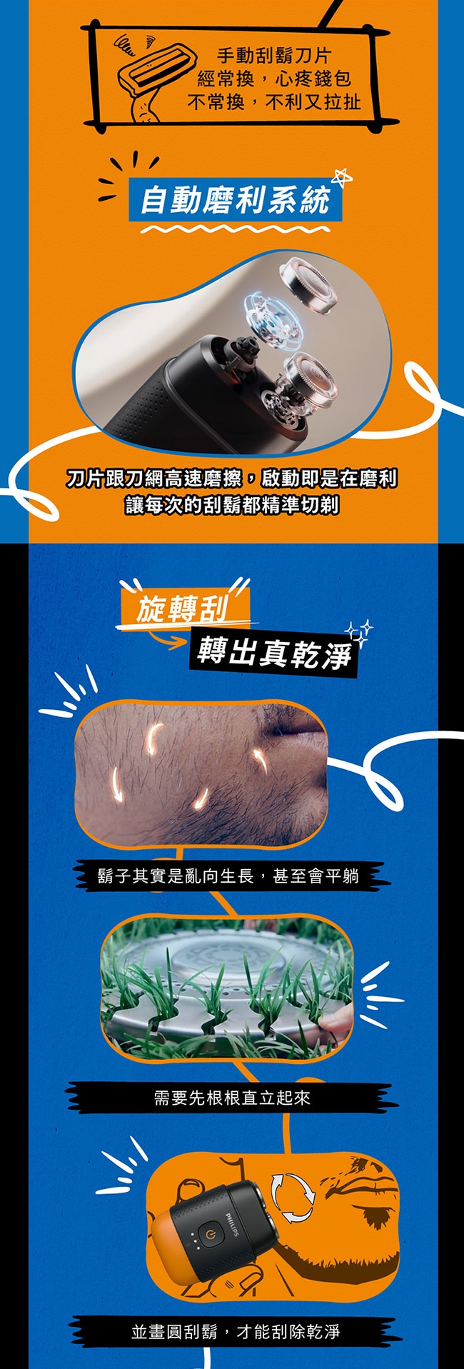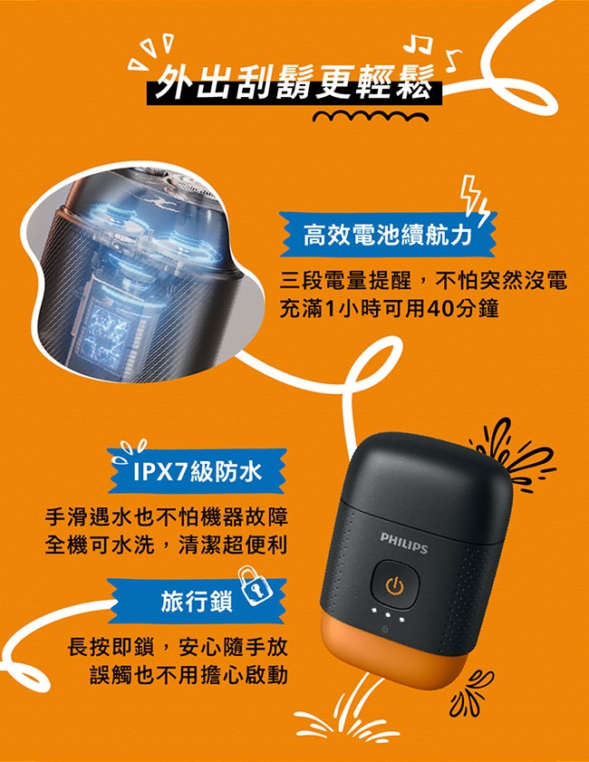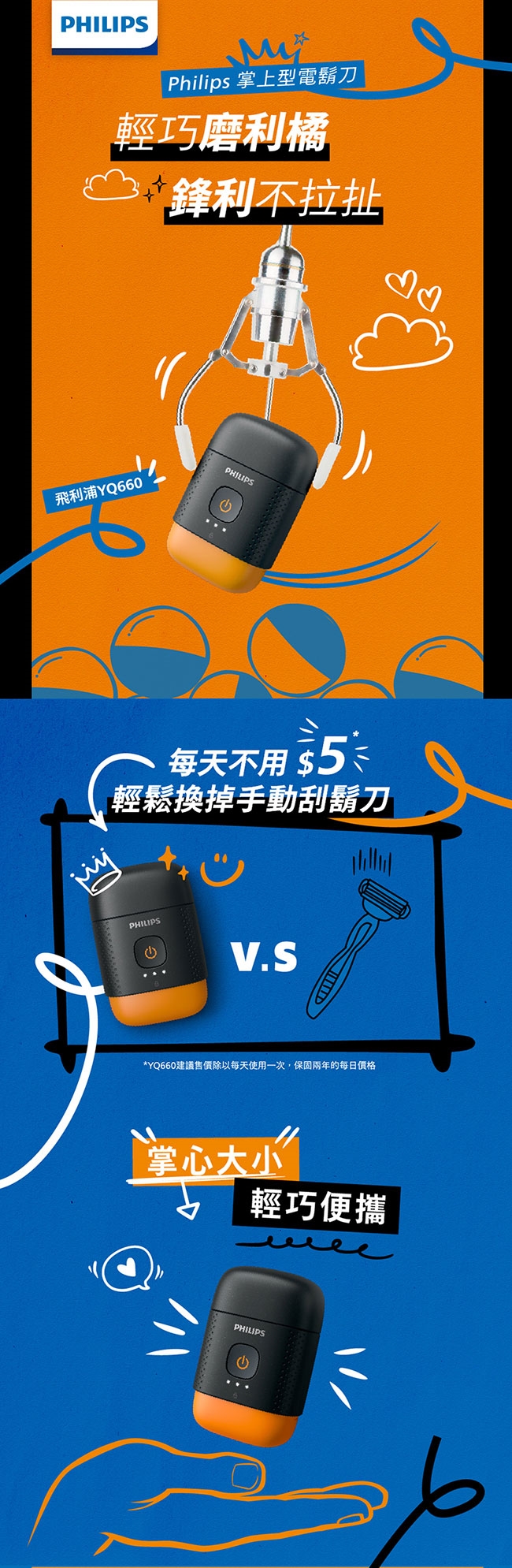 【Philips飛利浦】掌上型電鬍刀YQ660(磨利橘)