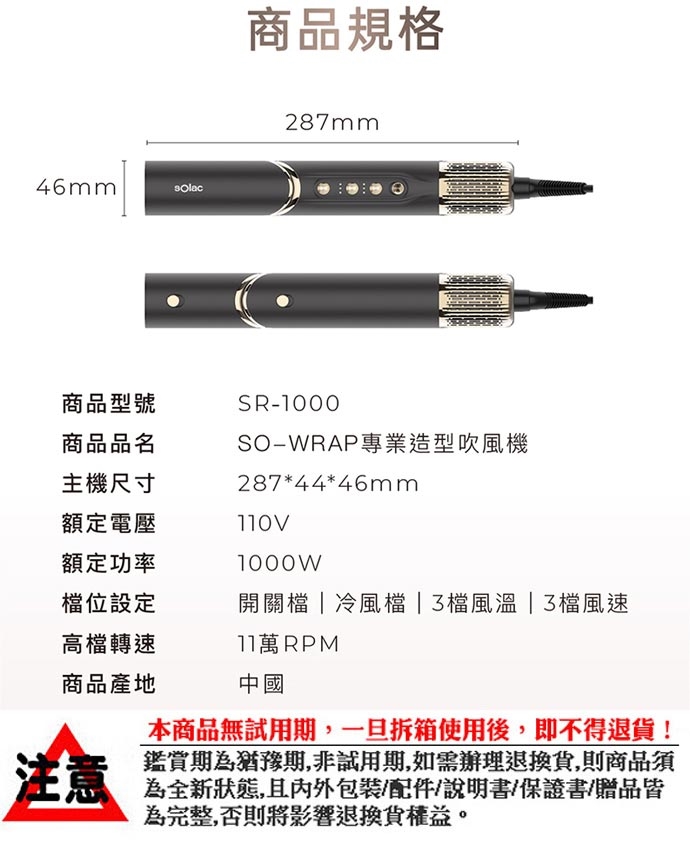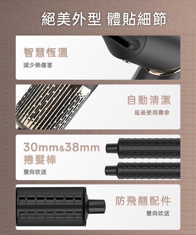 ★配件:快乾捲髮烘罩、造型集風吹嘴、防飛翹順髮風嘴、40mm造型圓梳