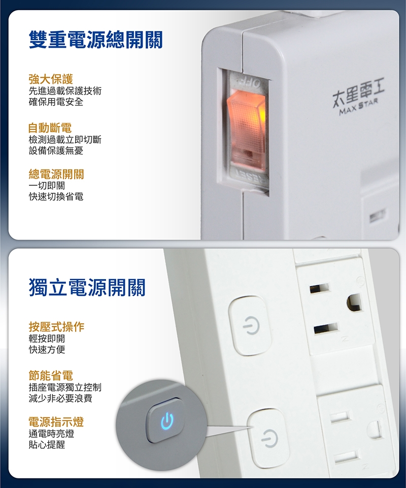 ‧總開關使用:電源總管理,一鍵即可管理所有電源,快速便利又安全。