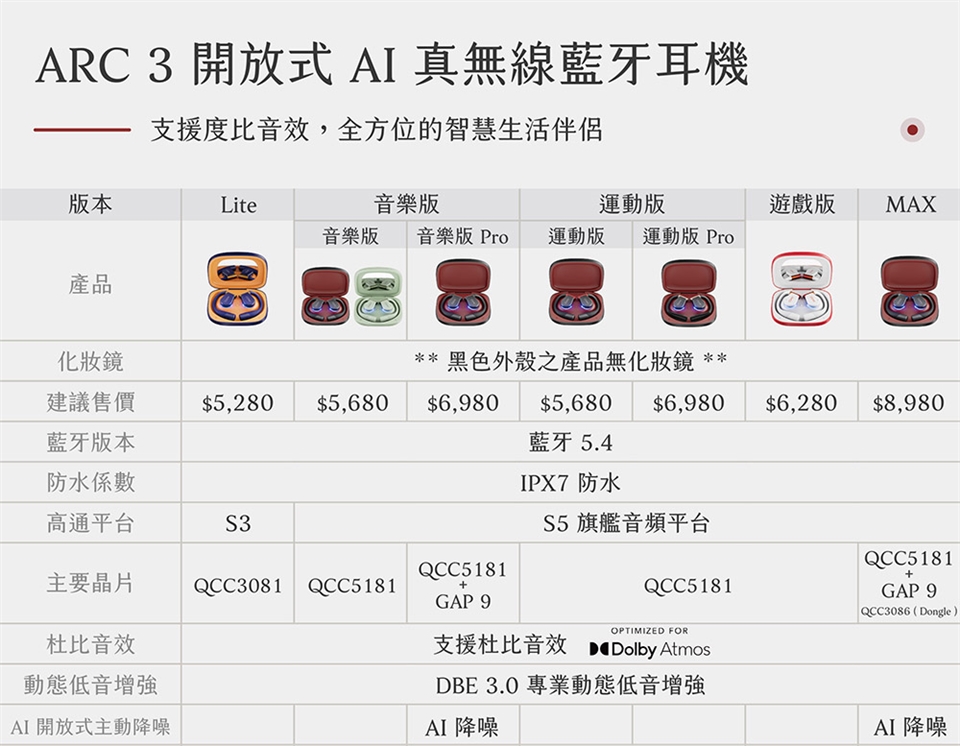 - 產品名稱:Cleer ARC 3 開放式AI降噪真無線藍牙耳機(音樂版Pro)