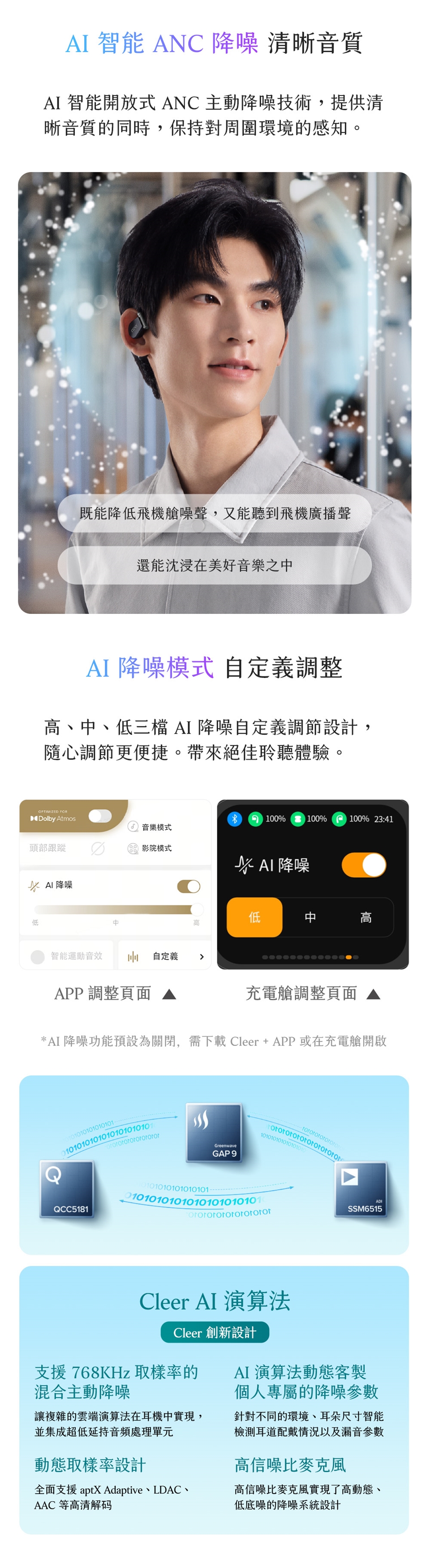 - 主動降噪|開放式 AI 智能 ANC 主動降噪技術