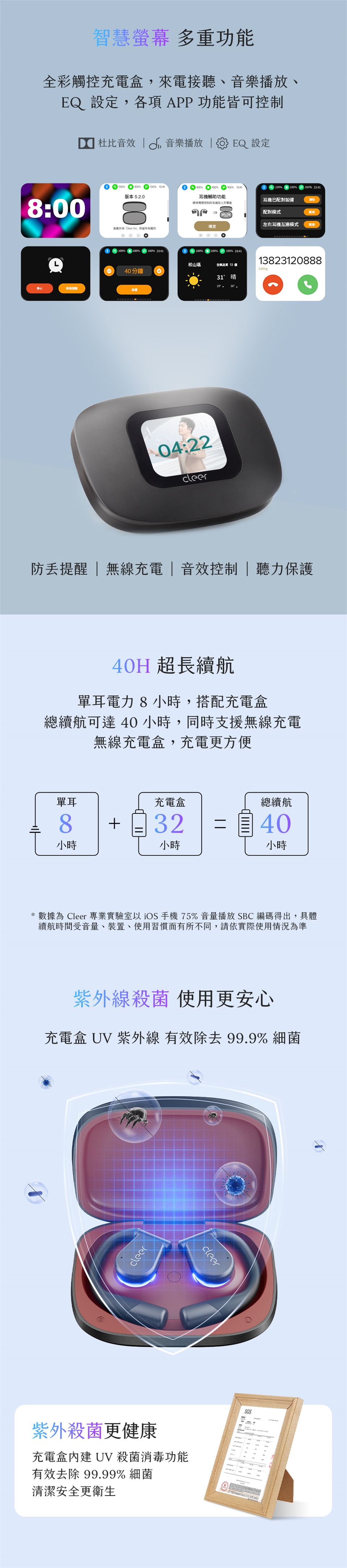 - 殺菌消毒|充電盒內建UV紫外線消毒燈,99.9%殺菌率