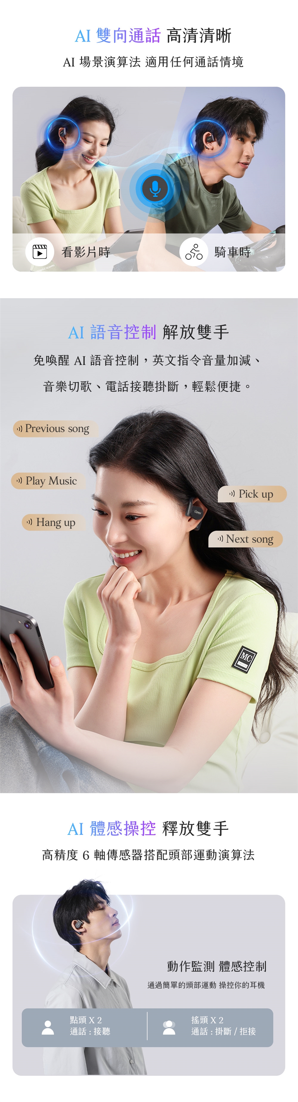 - 操控模式:觸控 / 體感 /語音 控制耳機 (點頭 / 搖頭 )