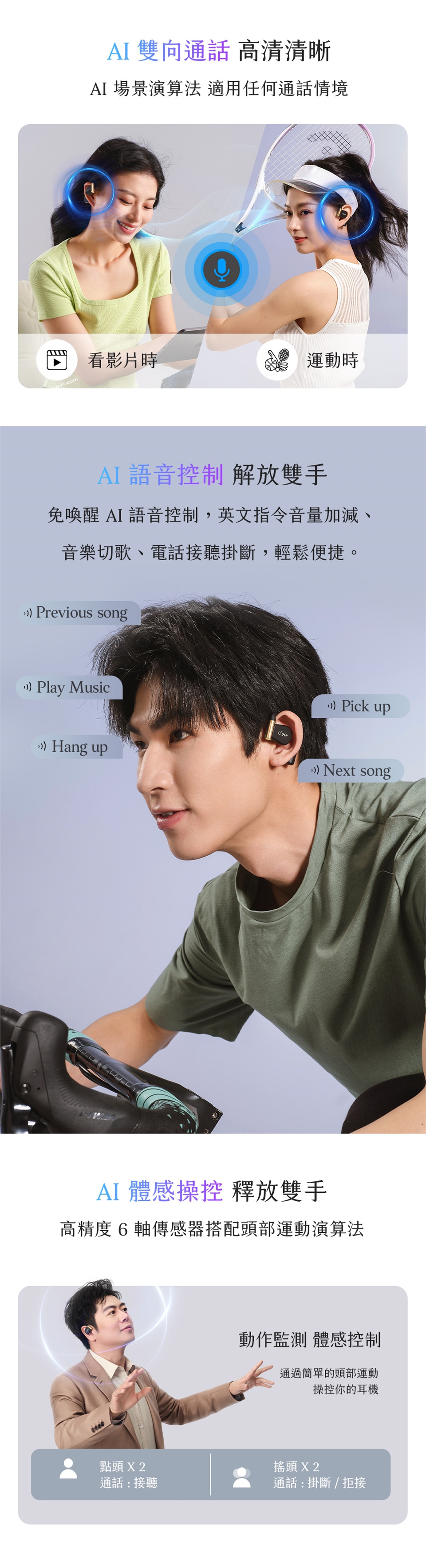 - 操控模式:觸控 / 體感 / 語音 控制耳機 (點頭 / 搖頭)