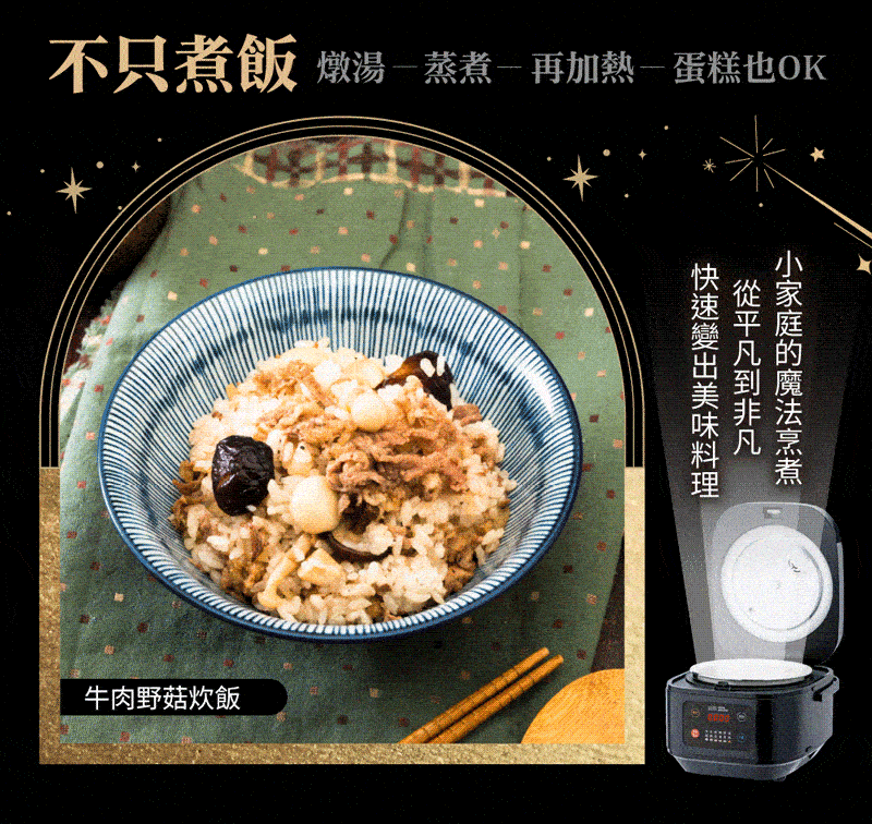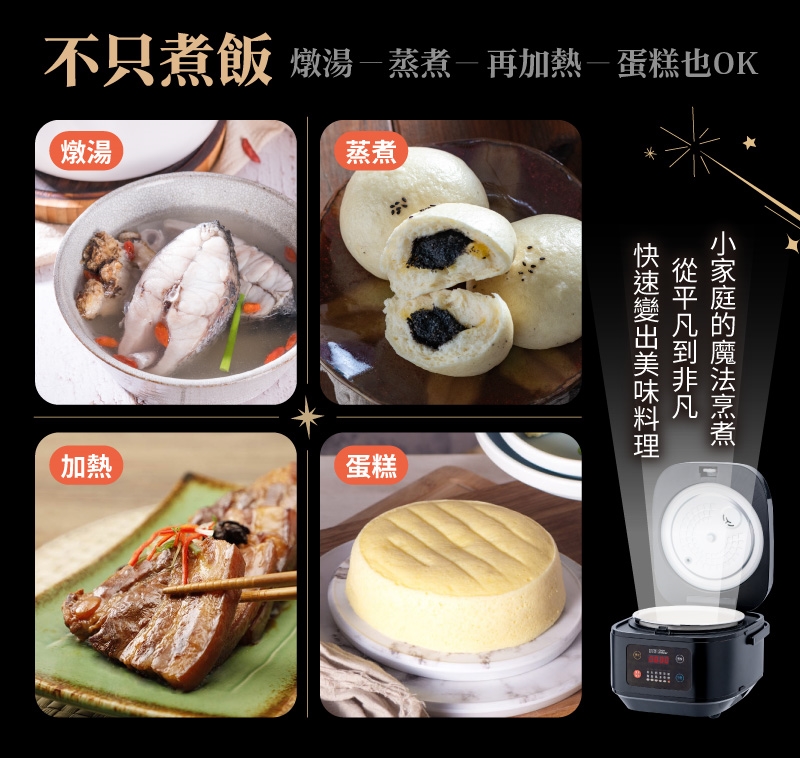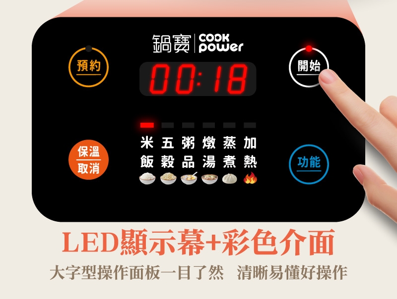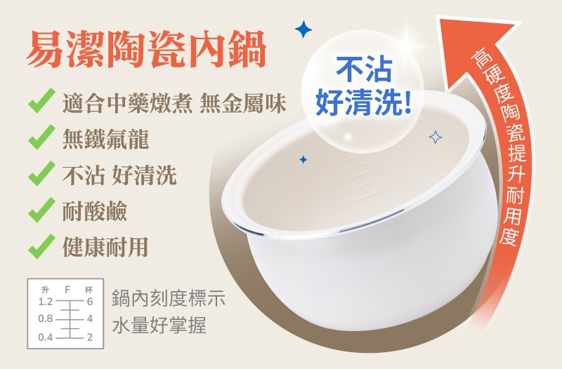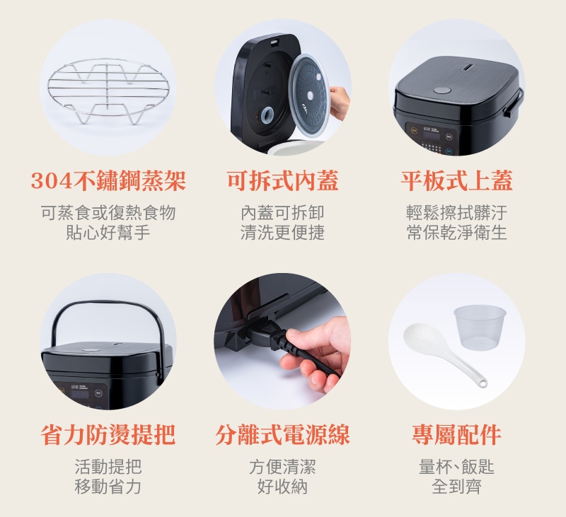 附件:陶瓷內鍋×1、量杯×1、飯匙×1、蒸架×1、電源線×1、說明書×1