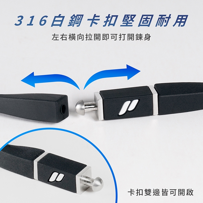 鍊身使用高彈性優質矽膠材質,具備優異的抗水、抗汗、抗汙與抗敏效果,即使長時間配戴或在運動、洗澡、游泳等環境中使用,也能維持穩定品質。搭配316L不鏽鋼卡扣設計,堅固耐用不易鬆脫,耐磨抗鏽,質感與功能兼具。