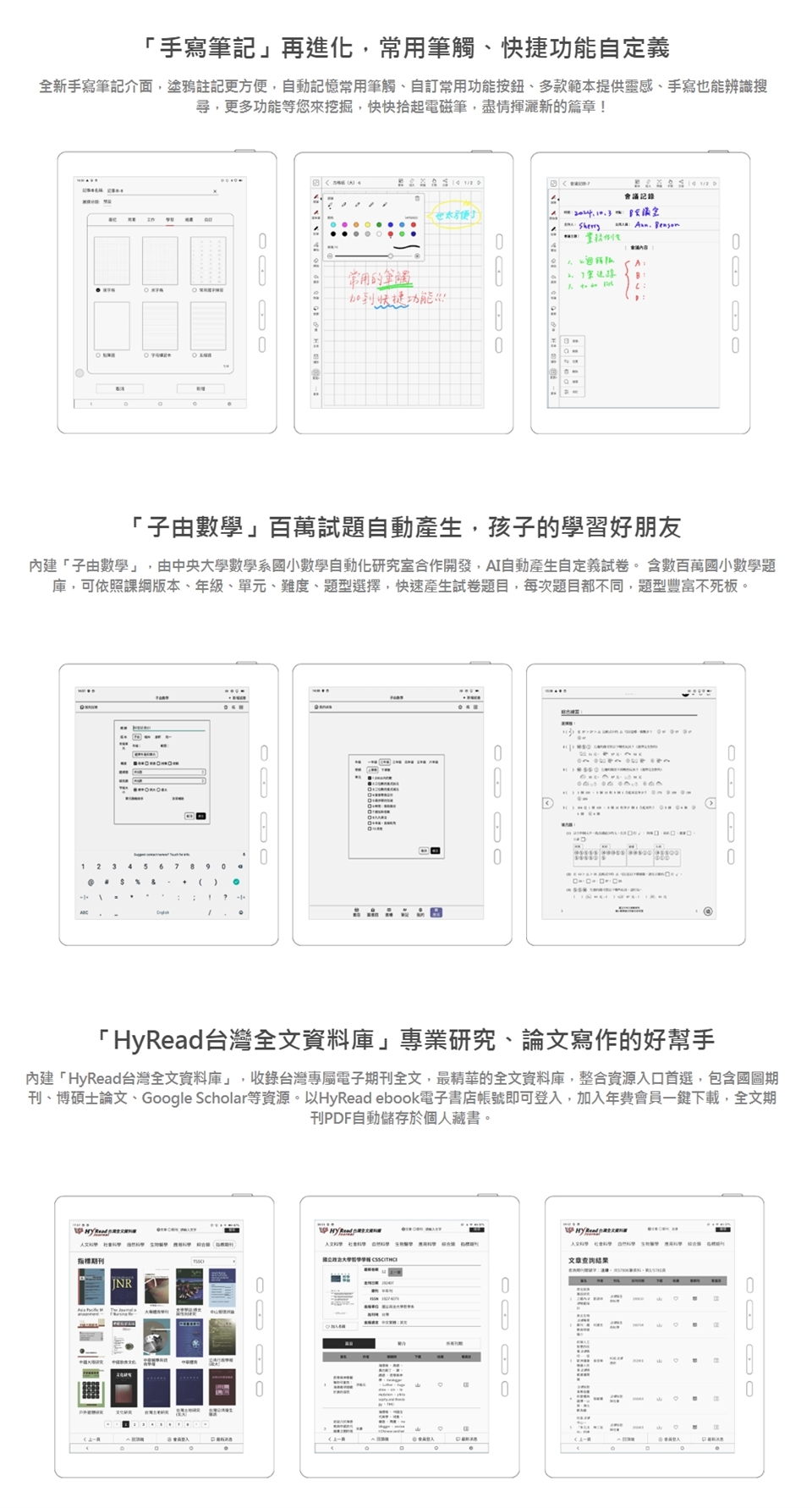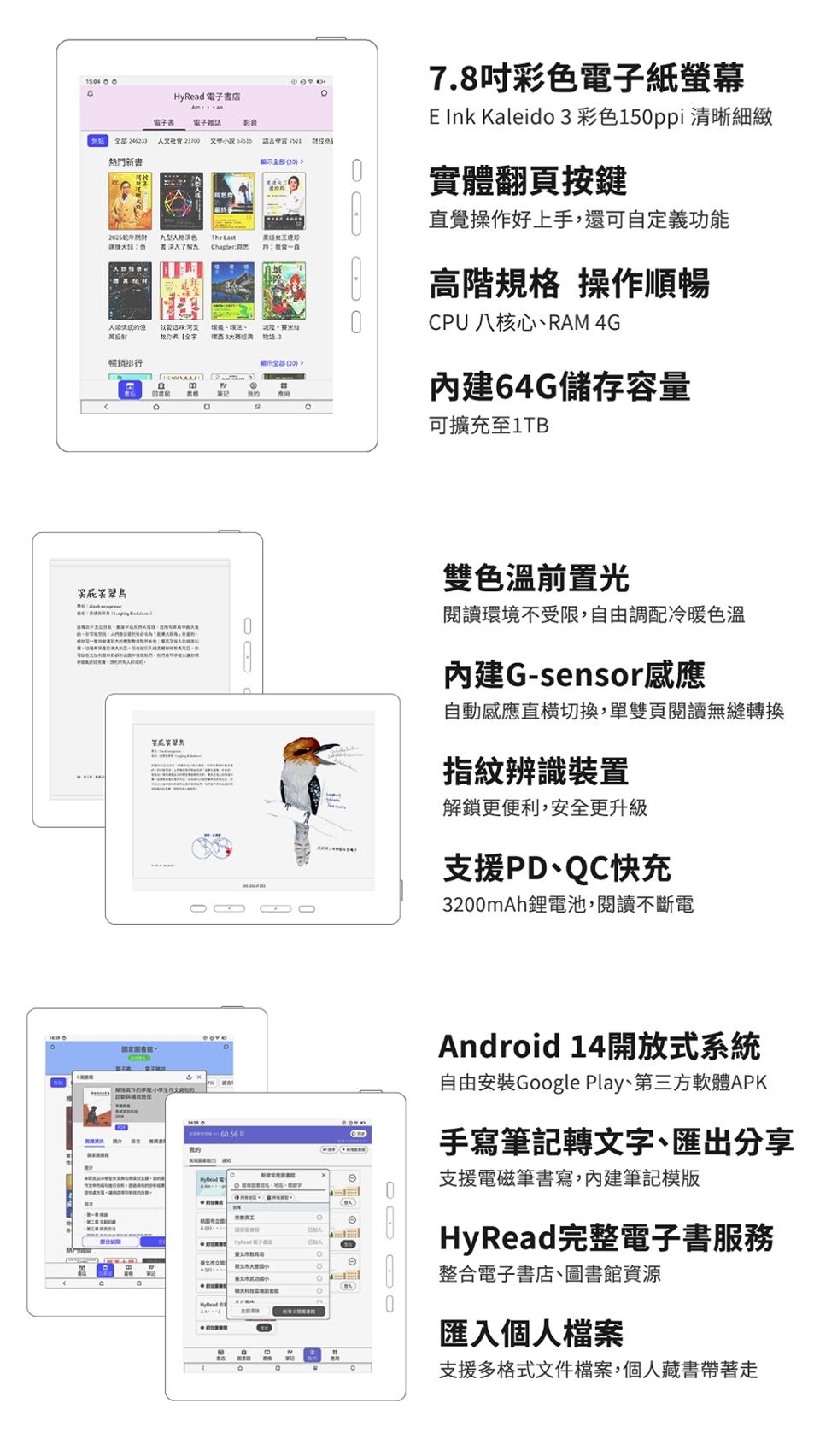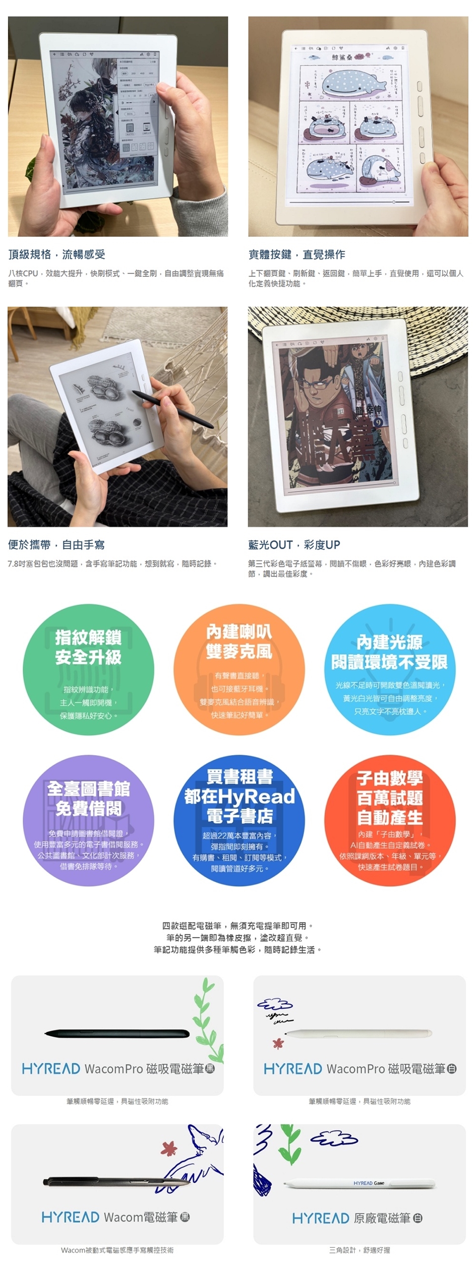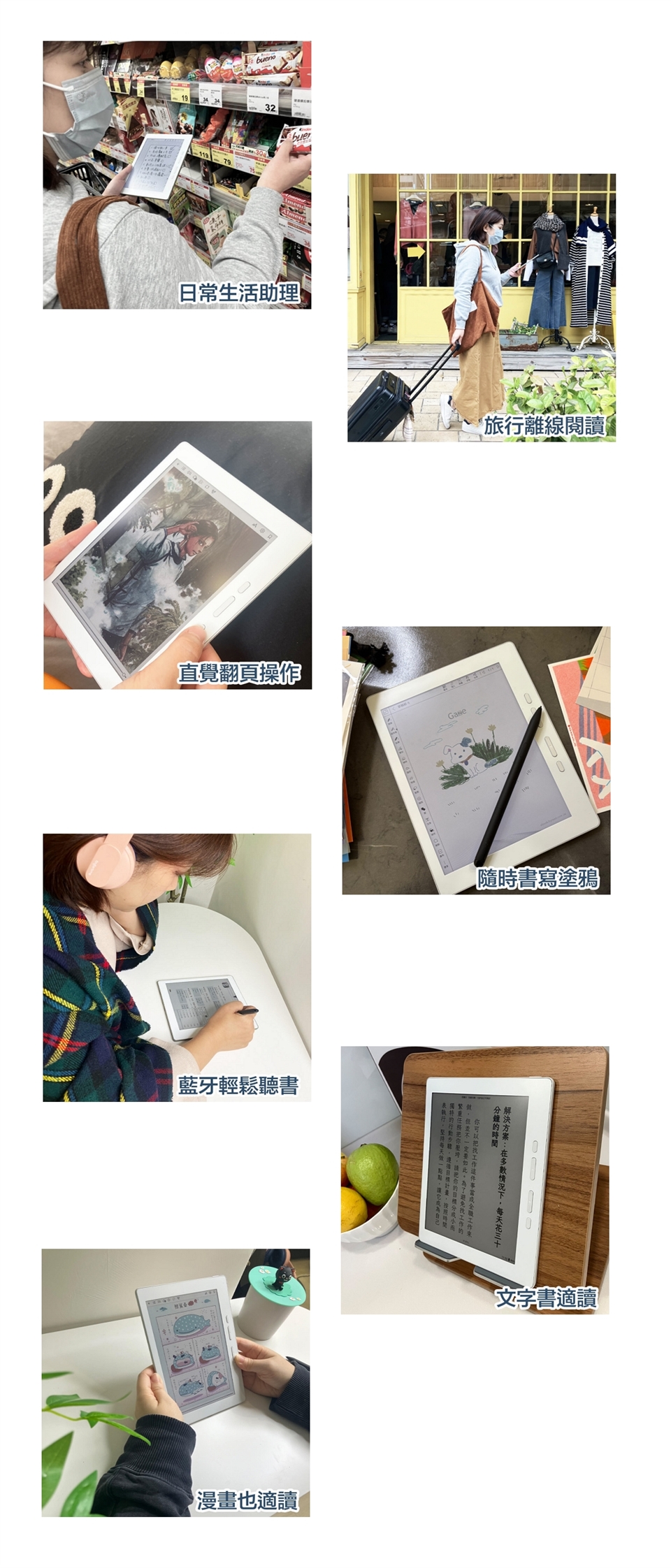 螢幕特性:電子紙閱讀器採E Ink電子紙顯示器,如紙般輕薄,由塑膠薄膜及薄玻璃製成,與生活中使用的LCD螢幕完全不同,無法承受外力撞擊、摔落、單點施壓、物品重壓等,皆可能造成螢幕損壞,請您使用上務必留意。