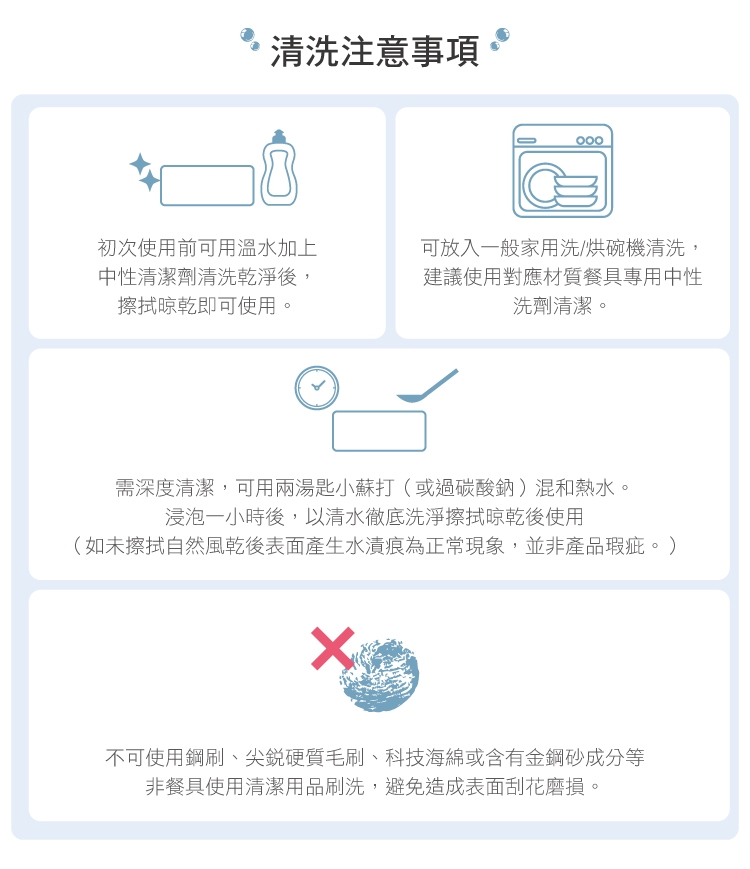 ✦不可使用鋼刷、尖銳硬質毛刷、科技海綿或含有金鋼砂成分等非餐具使用清潔用品刷洗,避免造成表面刮花磨損