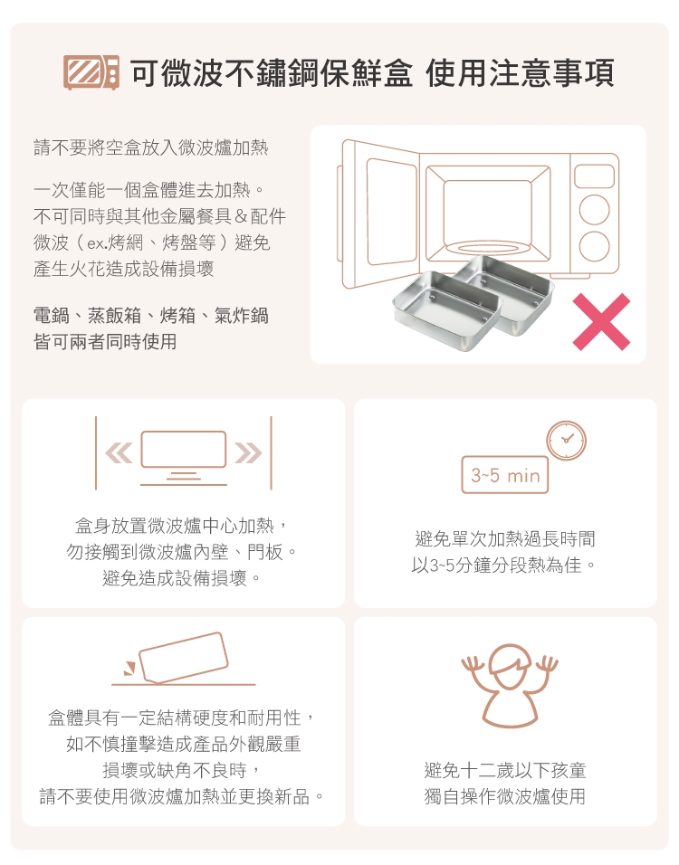 ✦請不要將空盒放入微波爐加熱,一次僅能一個盒體進去加熱,不可同時與其他金屬餐具&配件微波(ex.烤網、烤盤等)避免產生火花造成設備損壞