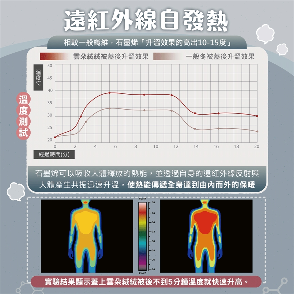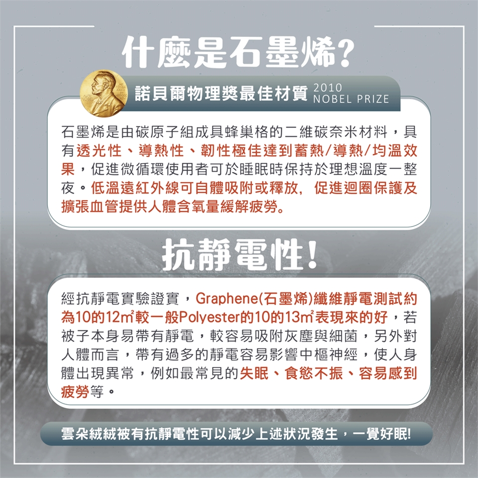 ✓ 添加石墨稀快速導熱、保暖蓄熱力高、釋放電荷,防止靜電