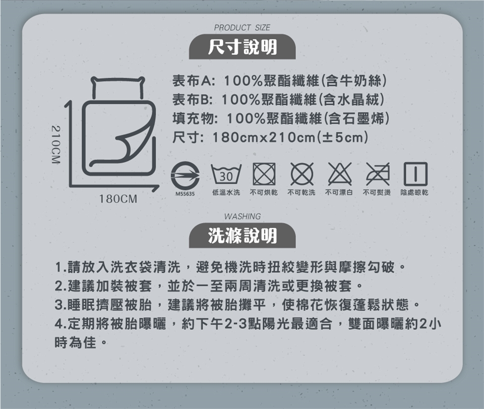 ※洗滌說明:1.請套入洗衣袋清洗,避免機洗時扭絞變形與摩擦勾破。2.建議加裝被套,並於1~2周清洗或更換被套。3.睡眠擠壓被胎,建議將被胎鋪平,使棉花恢復蓬鬆狀態。4.定期將被胎曝曬,約下午2-3點光最適合,雙面曝曬約2小時為佳。