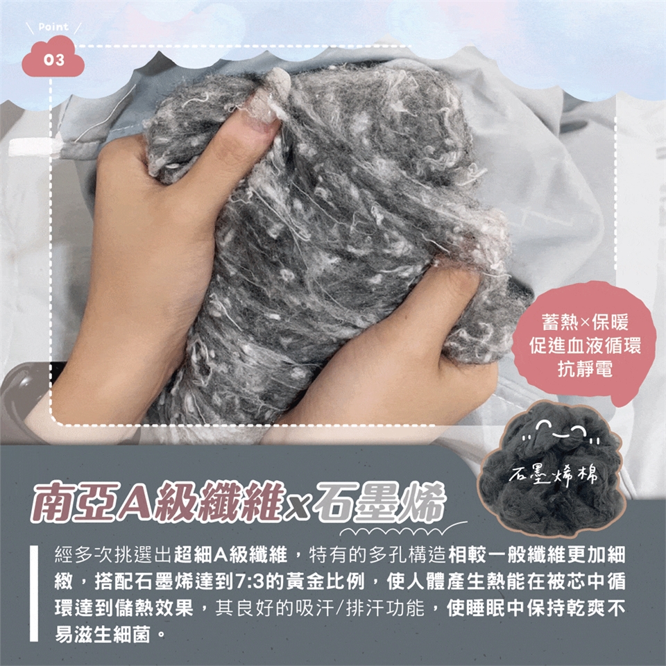 填充物 : 100%南亞A級超細聚酯纖維 (含石墨稀纖維)