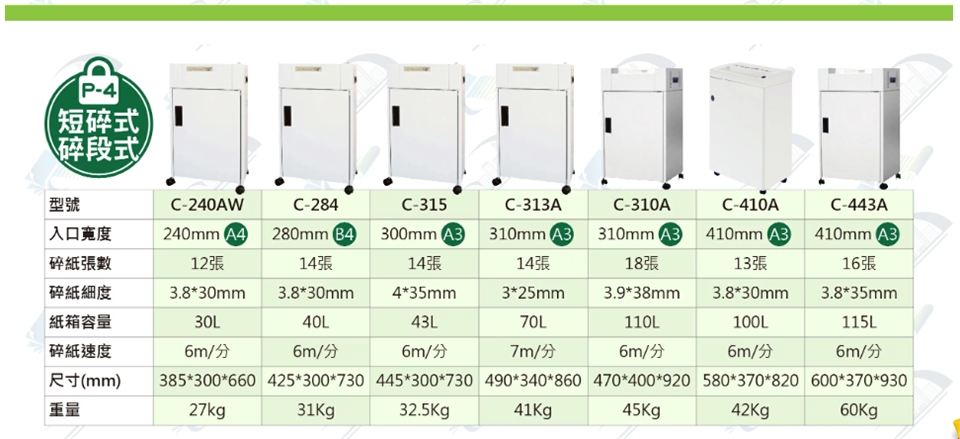 ◆安全裝置:1.入紙超量時,即自動停機,故障指示燈亮 2.馬達超載過熱時,即自動停機 3.紙屑筒裝滿時,滿紙指示燈亮,提醒清理紙屑。