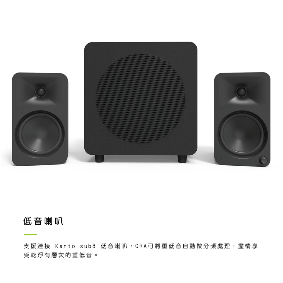 支援連接 Kantosub8 低音喇叭,ORA4可將重低音自動做分頻處理,盡情享受乾淨有層次的重低音。