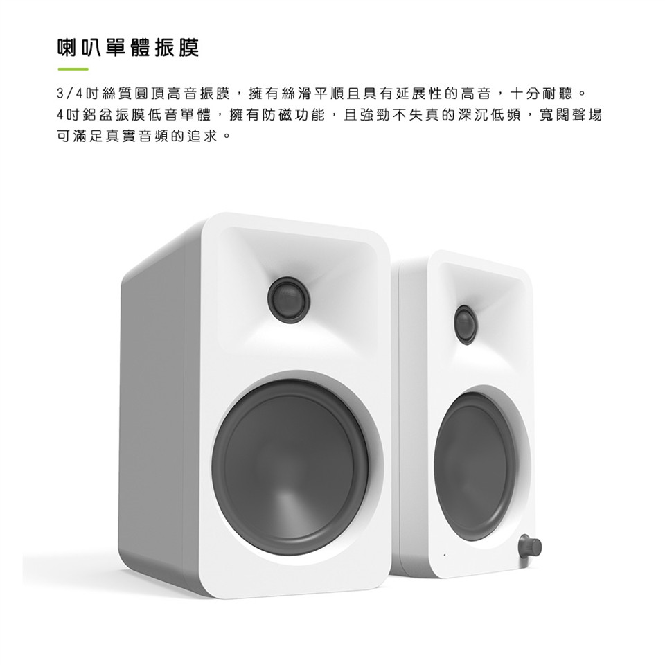 4吋鋁盆振膜低音單體,強勁不失真的深沉低頻,寬闊聲場可滿足真實音頻的追求。