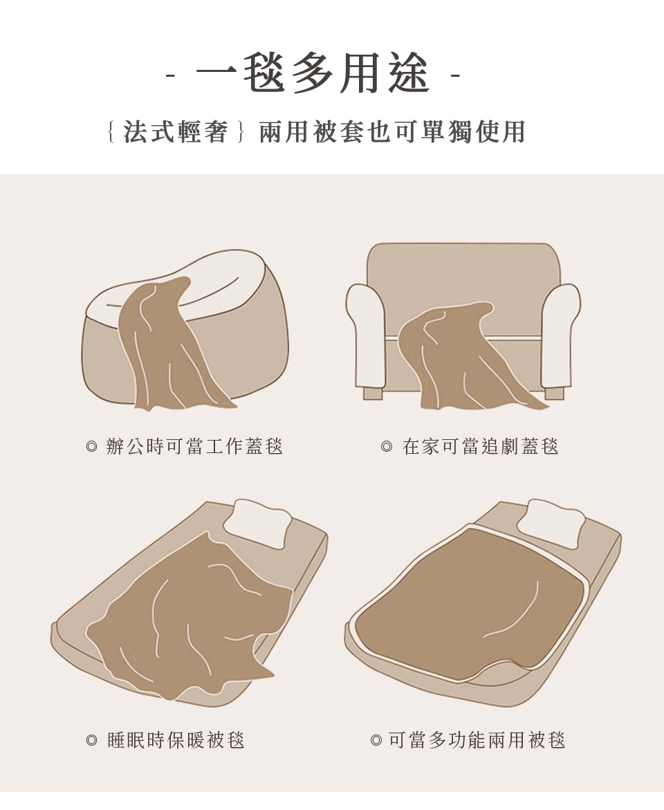 隱藏式拉鍊設計,可加入被胎保暖,或直接當保暖毯使用,滿足多種日常需求,不管是當蓋毯或床鋪毯、賴在沙發追劇當披毯都很適合。