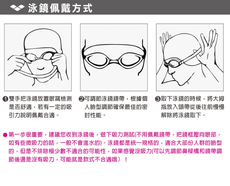 (1)雙手把泳鏡放置眼窩檢測是否舒適,若有一定的吸引力說明佩戴合適。