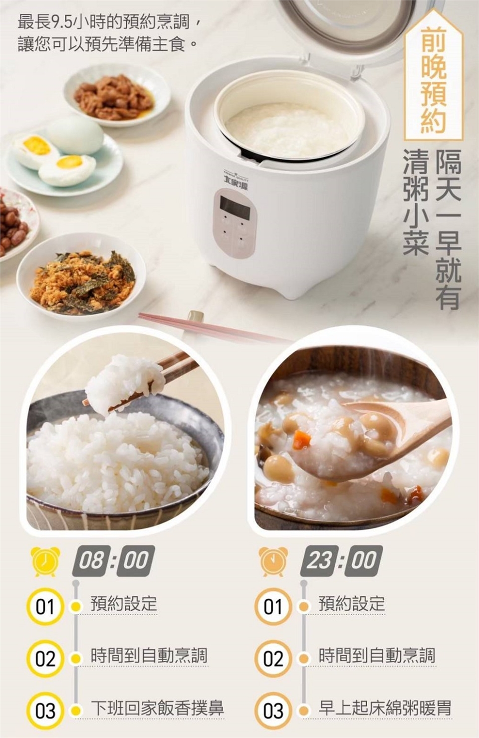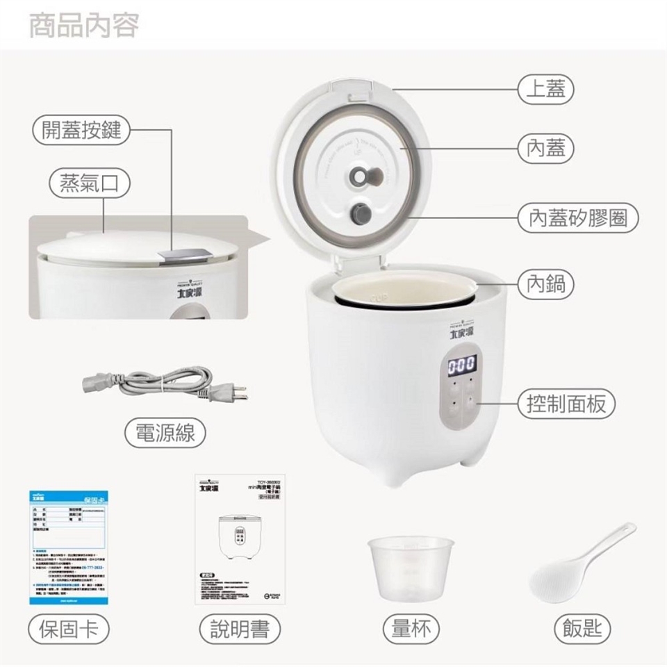 2. 多功能模式:米飯、粥品、定時、保溫/取消。