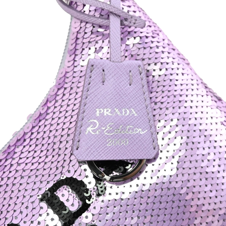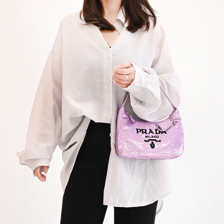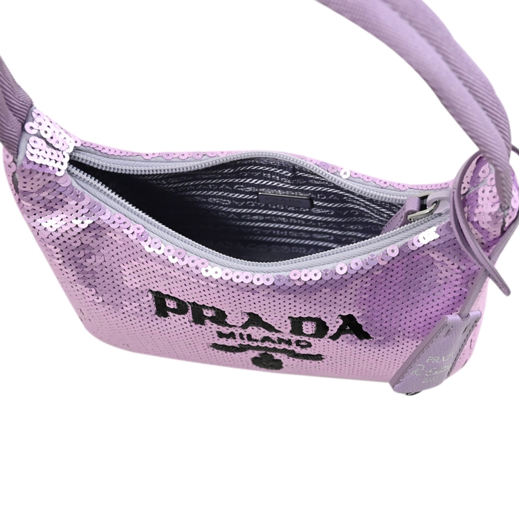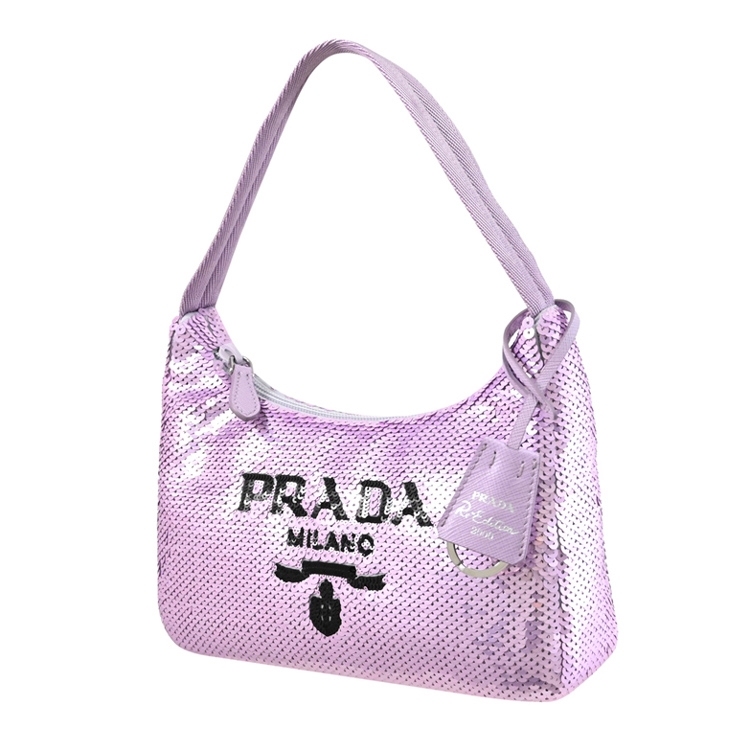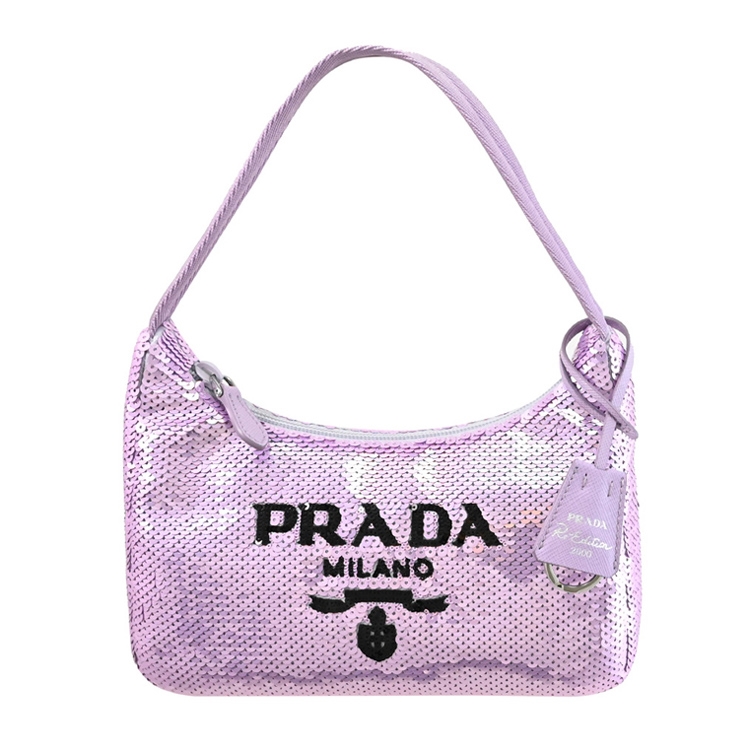 PRADA專櫃新款,熱銷經典手提肩背包,經典LOGO滿版亮片設計+質感尼龍材質,釋放出都會女仕優雅的時尚風格,展現自信魅力,拉鍊開口,附1可拆式鑰匙圈吊飾,可裝基本款長夾、手機等隨身小物,兼具典雅時尚氣質。