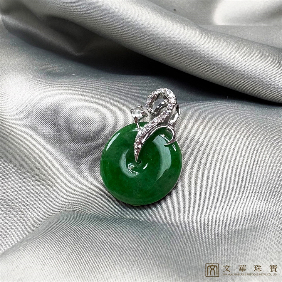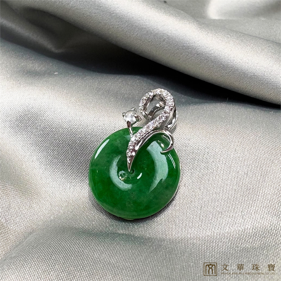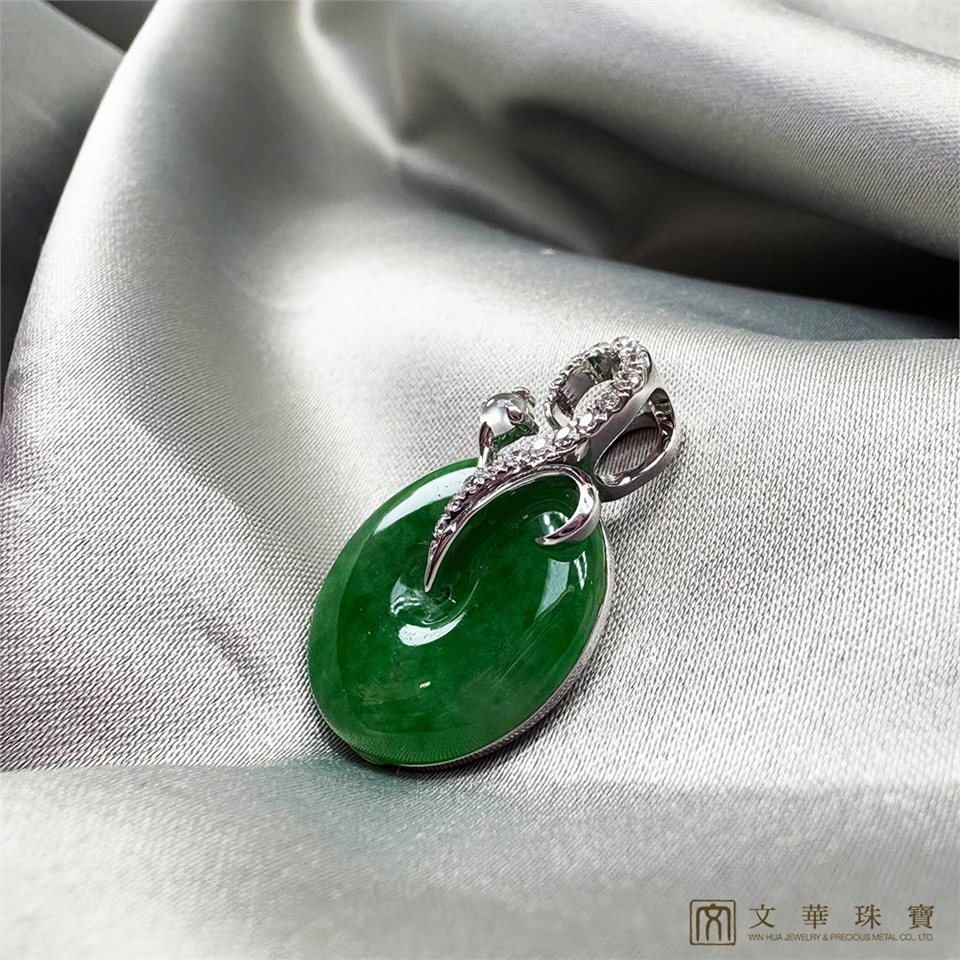 材質: 白K金585/小鑽共0.098ct;白翡蛋面乙枚