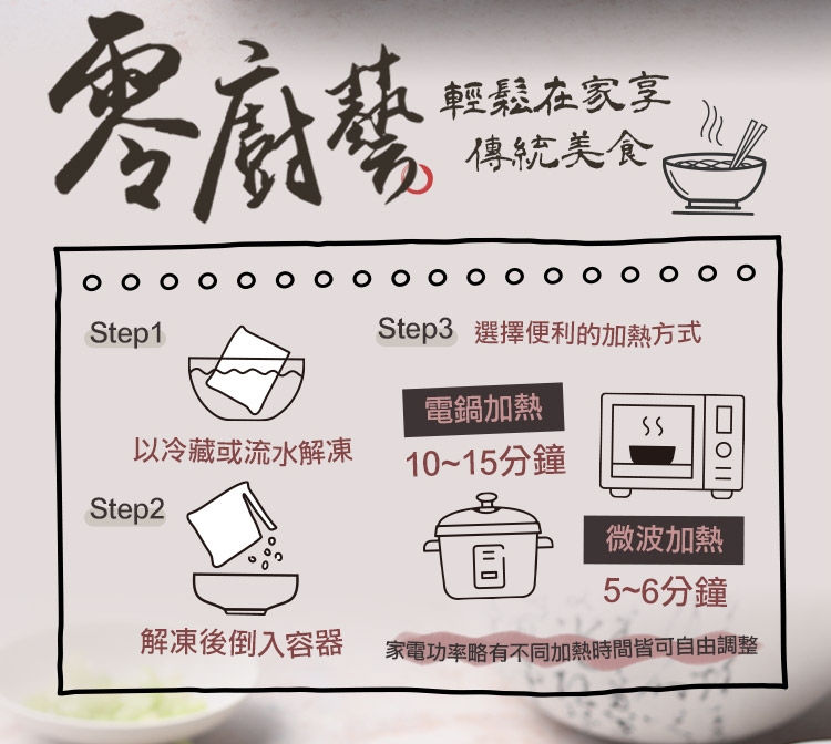 冷藏解凍至完全解凍即可。解凍後的調理包倒入容器,可電鍋加熱約10-15分鐘/微波加熱800w 5-7分鐘,至充分覆熱,方可食用。