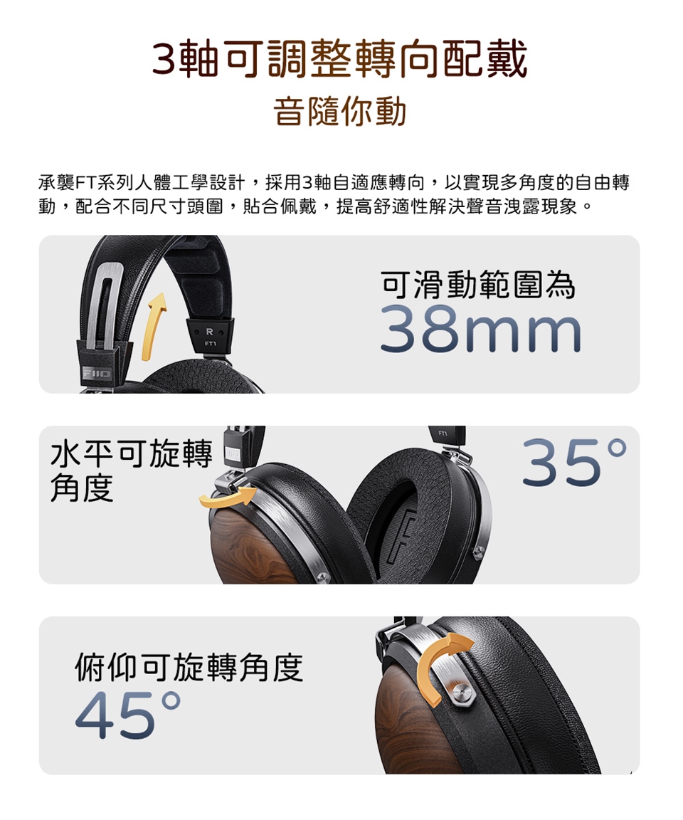 3軸可調整轉向配戴|FiiO FT1承襲FT系列人體工學設計,採用3軸可調整轉向,以實現多角度的自由轉動,配合不同尺寸頭圍,貼合佩戴,提高舒適性。