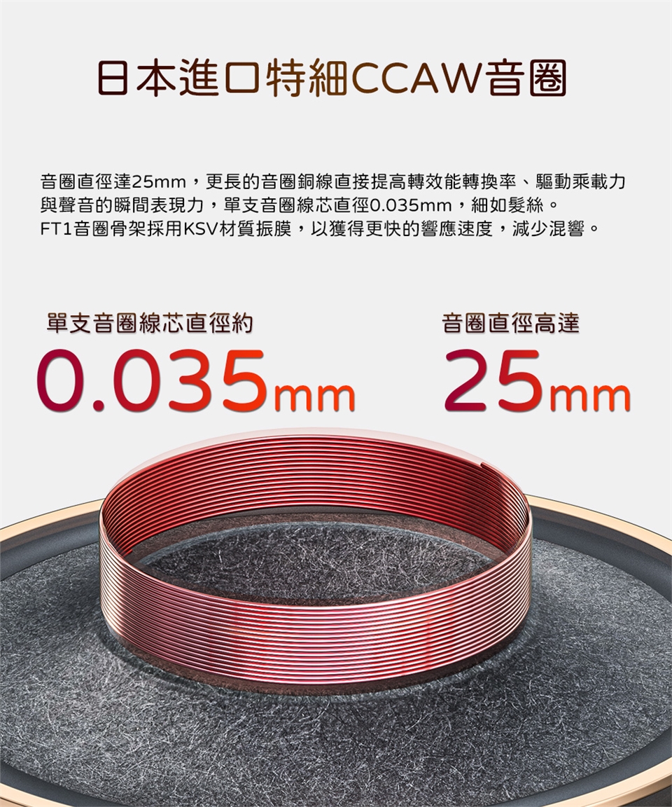 日本進口特細CCAW音圈|音圈直徑達25mm,更長的音圈銅線直接提高轉效能轉換率、驅動乘載力與聲音的瞬間表現力,單支音圈線芯直徑0.035mm,細如髮絲;FiiO FT1音圈骨架採用KSV材質振膜,以獲得更快的響應速度,減少混響。