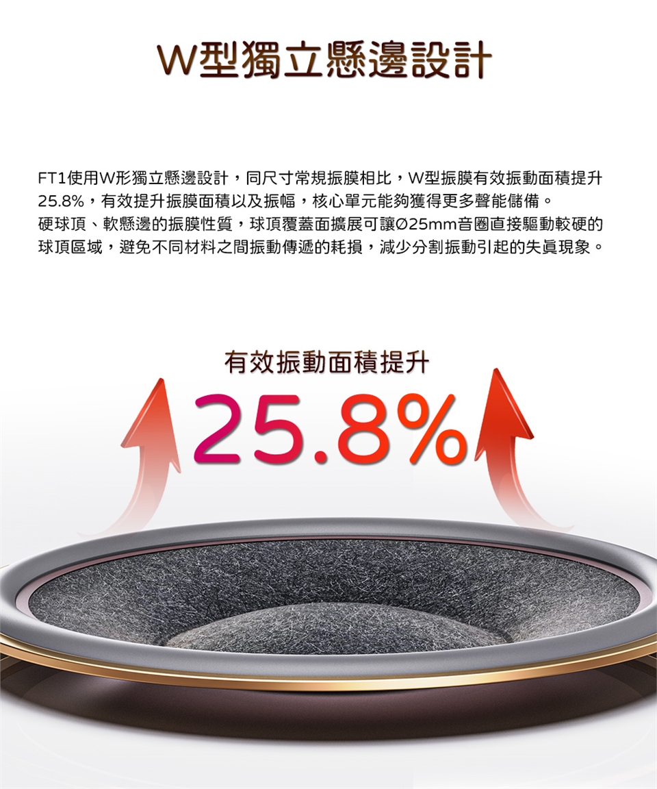W型獨立懸邊設計|W型振膜有效振動面積提升25.8%,提升有效振膜面積以及振幅,聲學核心單元能夠獲得更多聲能儲備。FiiO FT1為硬球頂、軟懸邊的振膜性質,球頂覆蓋面擴展可讓Ø25mm音圈直接驅動較硬的球頂區域,規避因不同材料之間振動傳遞的耗損,減少分割振動而引起的失真現象。