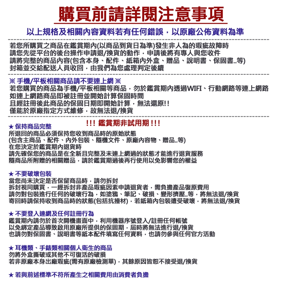 ※鑑賞期非試用期,鑑賞期間手機勿使用密碼鎖機功能、軟體升級、包膜、使用行動網路連線(3G/4G/5G/WIFI)上網註冊IMEI碼、刷機及其他會破壞手機原廠軟體的操作。