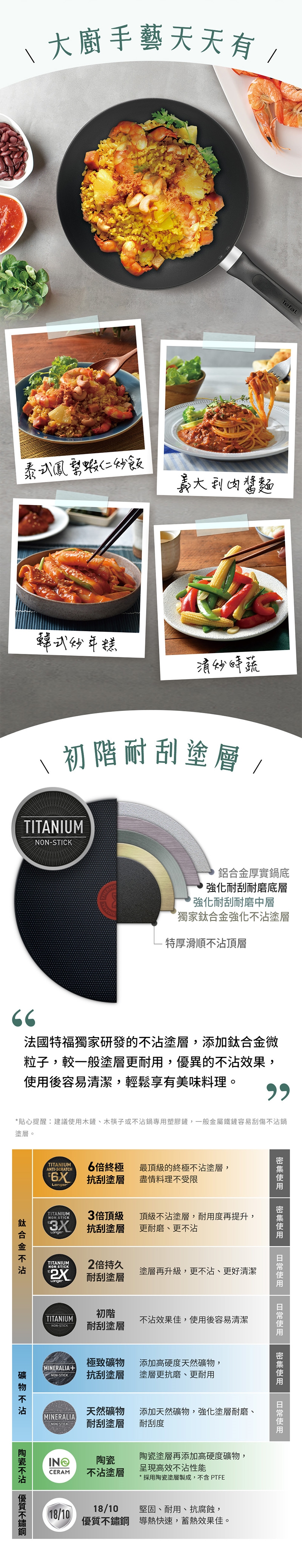 ◆TITANIUM鈦合金強化塗層,法國特福獨家研發塗層,添加鈦合金微粒子,優異的耐磨、抗刮性,不沾效果佳又好清洗。