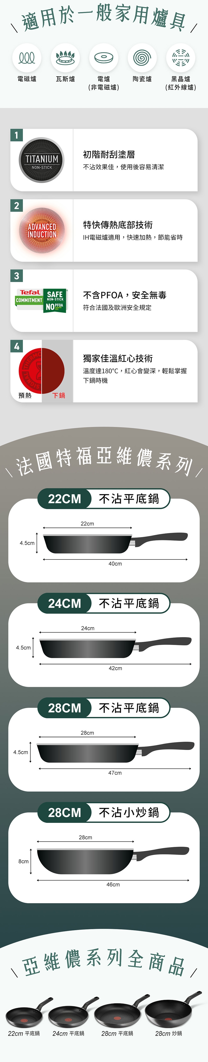 —適用於一般家用爐具:瓦斯爐、黑晶爐、紅外線爐、電爐、鹵素爐、電磁爐。
