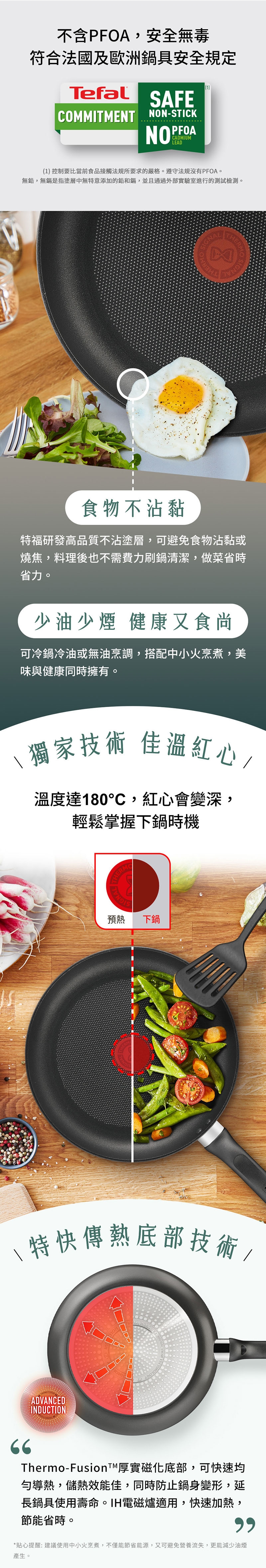 4.特福不沾鍋因鍋底設計具有高傳熱功能,建議用中小火烹調即可,節省能源又可避免營養流失,更能減少油煙的產生。