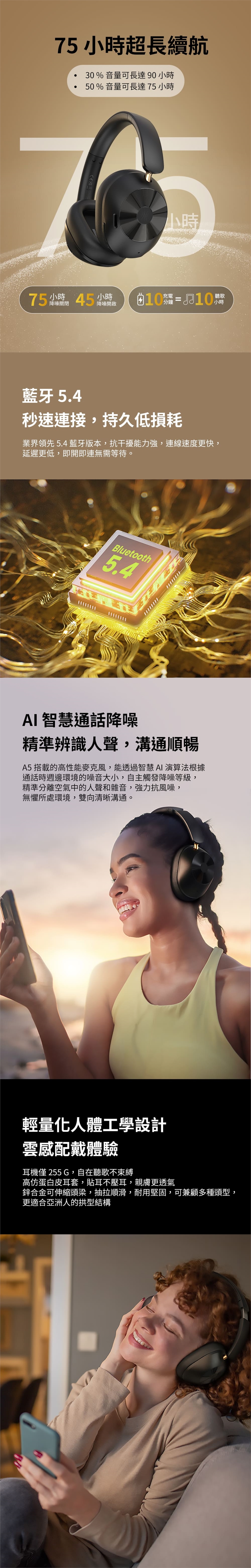- 續航時間:約45小時(開啟降噪); 約75小時(關閉降噪)