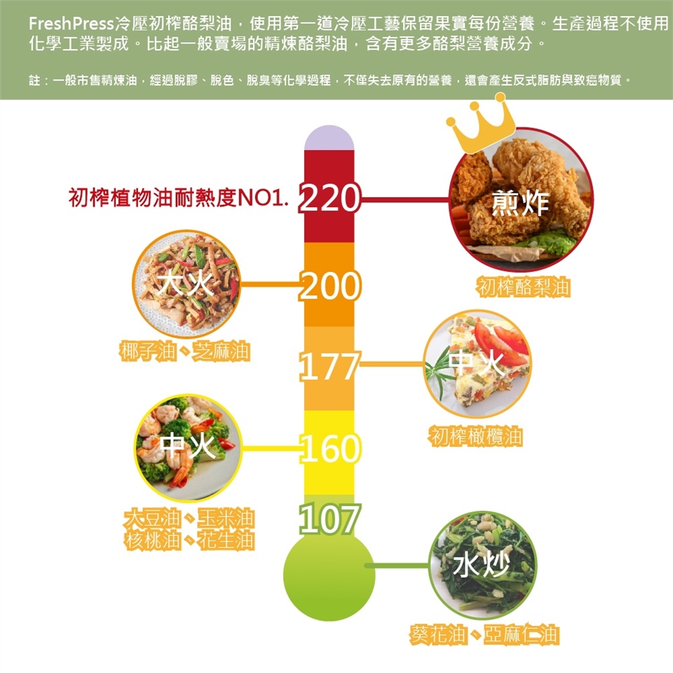 煎、煮、炒、炸、烤、涼拌、烘焙全適用