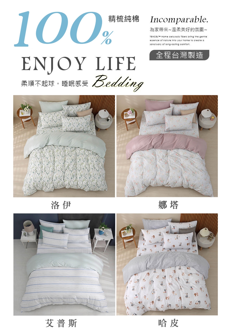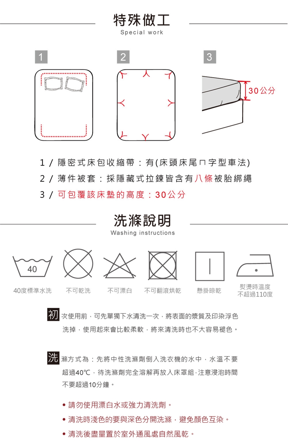 洗滌方式:先將中性洗滌劑倒入洗衣機的水中,水溫不要超過40度C,待洗滌劑完全溶解再放入床包組,注意浸泡時間不要超過10分鐘。