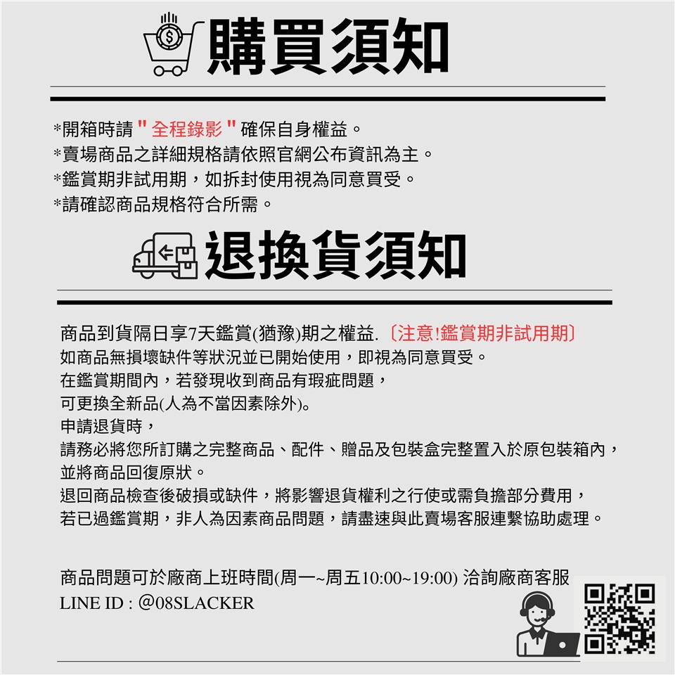 溫馨小提醒: 提醒您,鑑賞期非試用期,一經拆封則視同使用 原廠包裝皆為單次封條盒裝,拆封後盒裝即無法以新品販售 若非產品瑕疵退貨,將酌收整新處理費30%。 如有新品瑕疵狀況 請務必購買後透過平台客服反應,請勿直接退貨。 ★規格及隨機標準配備以實際出貨為主,原廠保留變更之權利。若有變更,恕不另行通知。謝謝