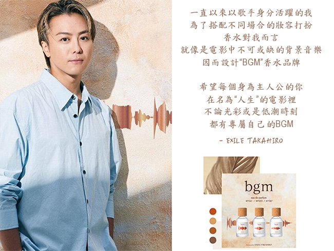 希望每個身為主人公的你,在名為“人生”的電影裡,不論光彩或是低潮時刻,都有專屬自己的BGM”by EXILE TAKAHIRO。