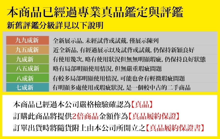 • 商品到貨享十天猶豫期之權益(注意!猶豫期非試用期),辦理退貨商品必須是全新狀態且包裝完整,商品一經拆封,恕無法退換貨,請先確認商品,以免影響您的權利,祝您購物順心 - 有無保固:無保固 - 保固範圍:10天鑑賞期內 - 退貨限制:必須於10天鑑賞期內提出,商品上的標籤不可撕毀,內容物與贈品皆需完整。 - 商品圖檔顏色因電腦螢幕設定差異會略有不同,以實際商品顏色為準。