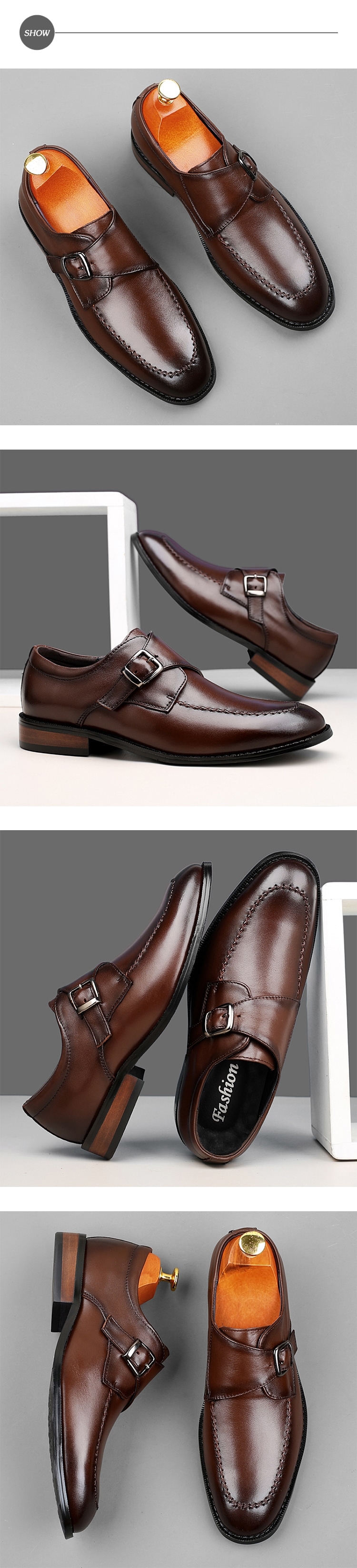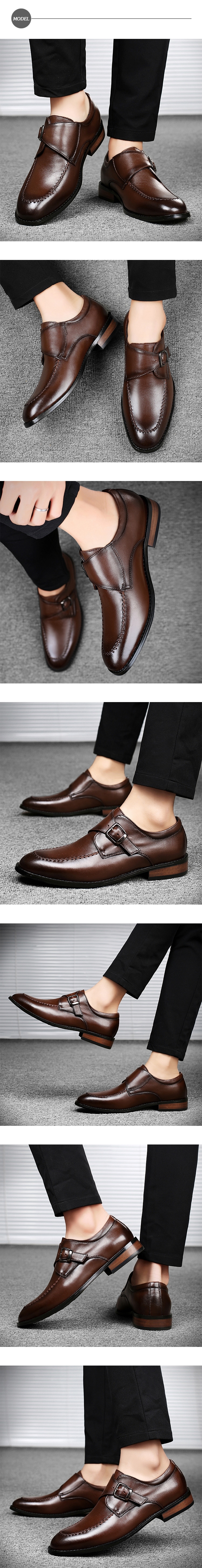 【ANSEL】全真皮皮帶釦尖頭粗跟皮鞋/全真皮頭層牛皮復古皮帶釦飾小尖頭粗跟皮鞋 男鞋 棕