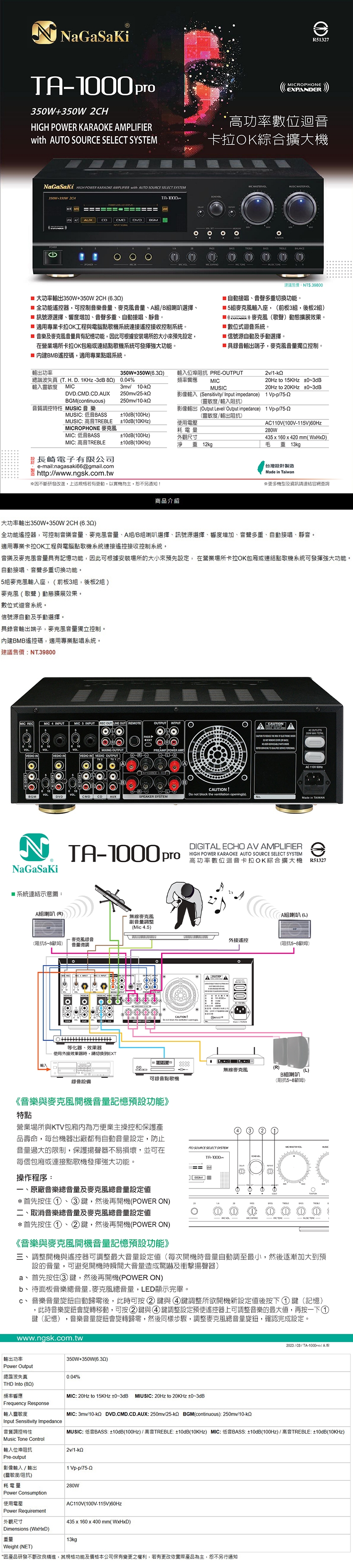NaGaSaKi TA-1000PRO高功率數位迴音卡拉OK綜合擴大機~卡拉OK擴大機推薦