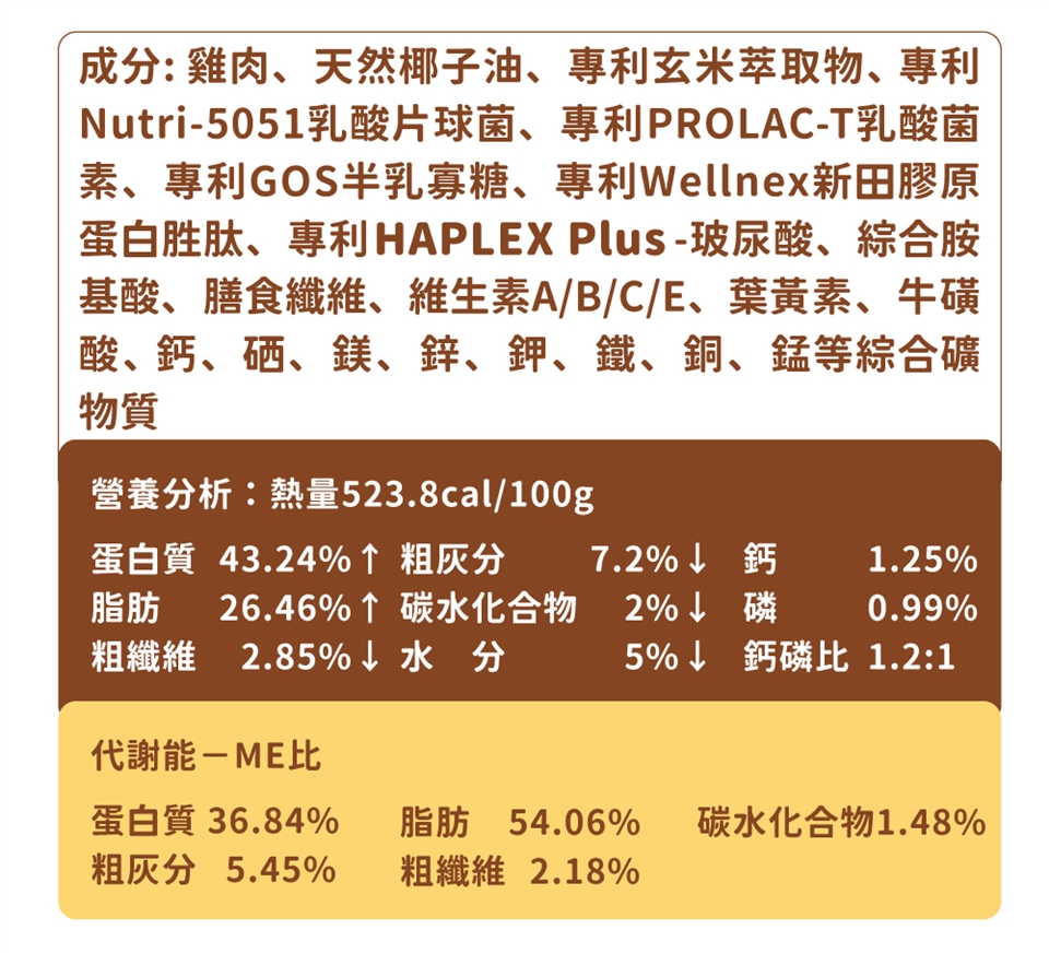 蛋白質 43.24%↑ 脂肪 26.46%↑ 水分 5%↓ 碳水化合物 2%↓ 粗灰分 7.2%↓ 粗纖維 2.85%↓ 鈣 1.25% 磷 0.99% 鈣磷比 1.2 : 1