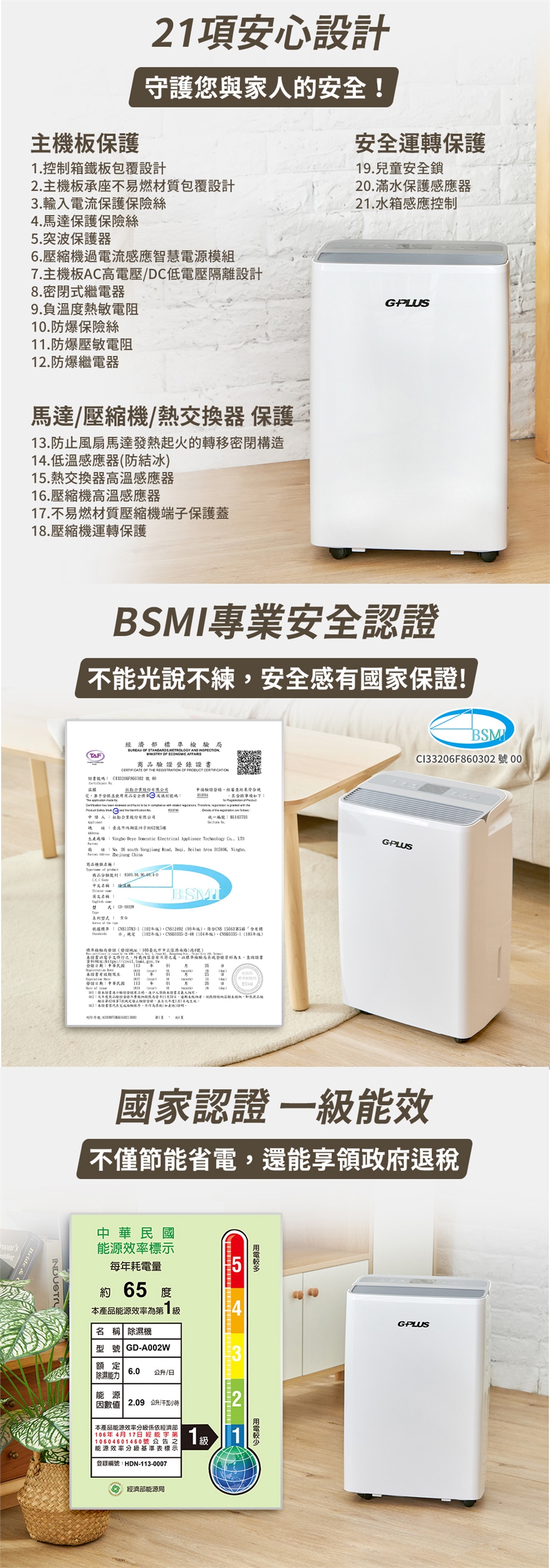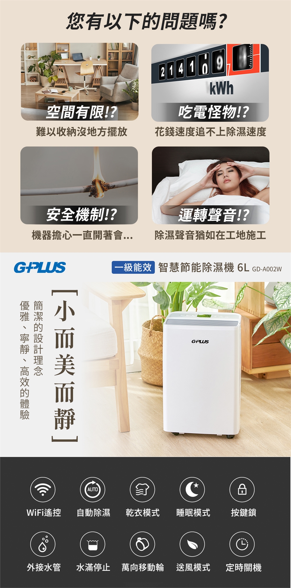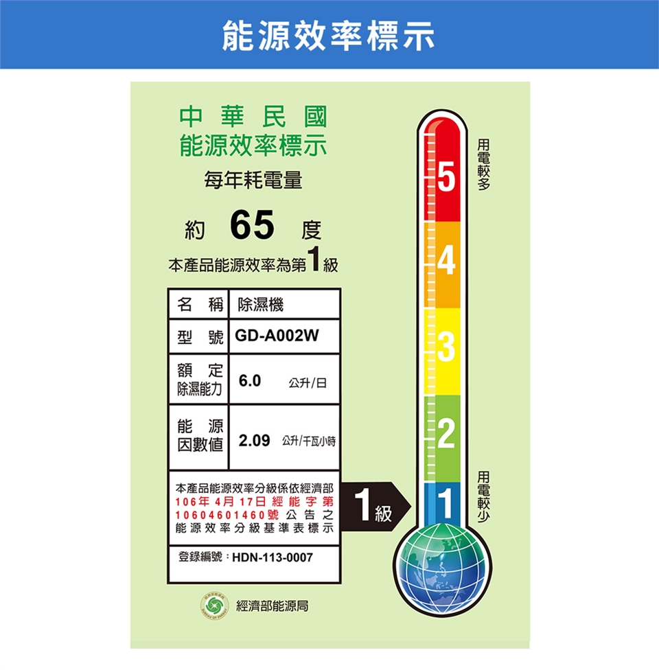 (1) 6L/日除濕能力,一級能源效率