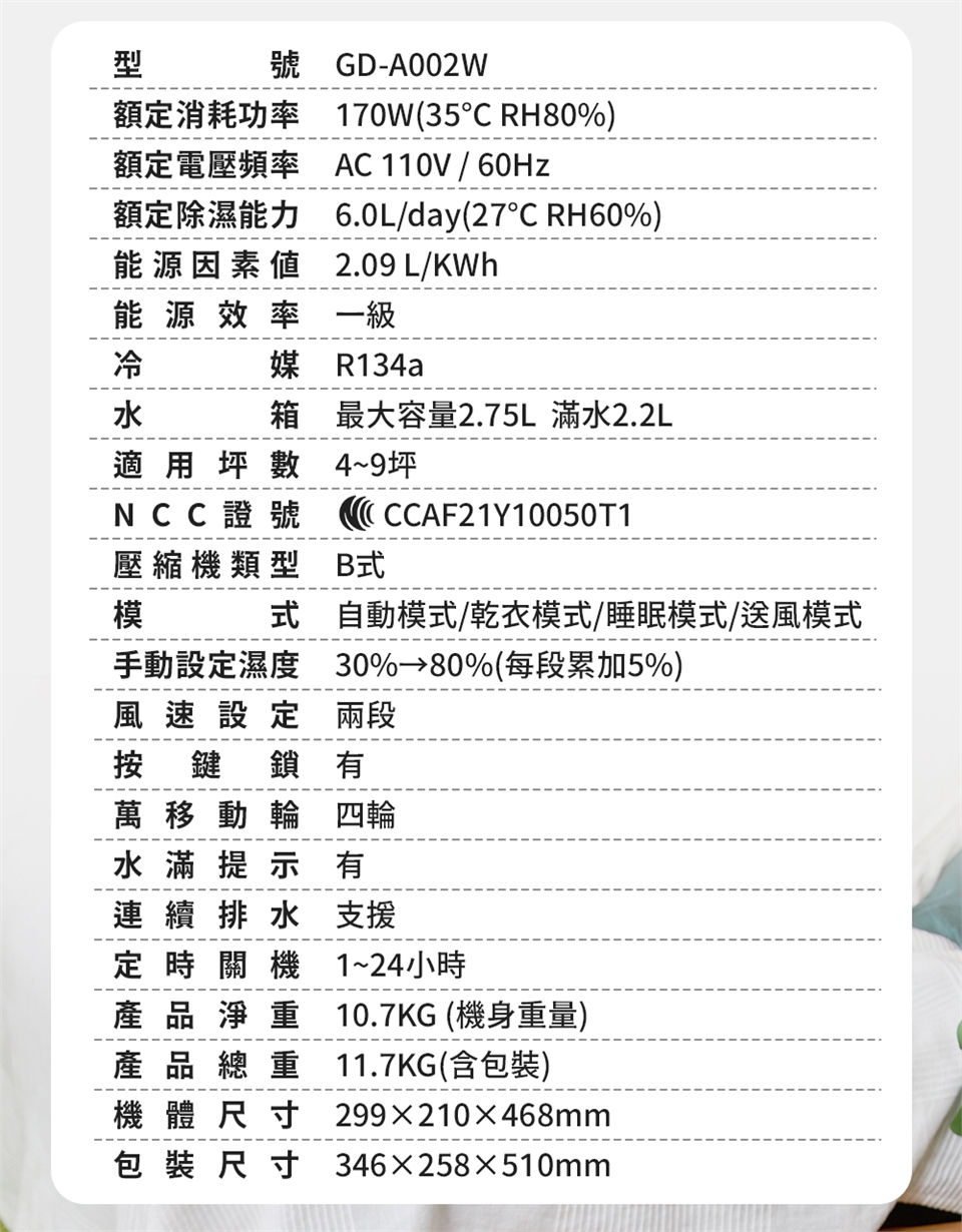 (9) 產品內容:主機*1、排水管*1、說明書*1