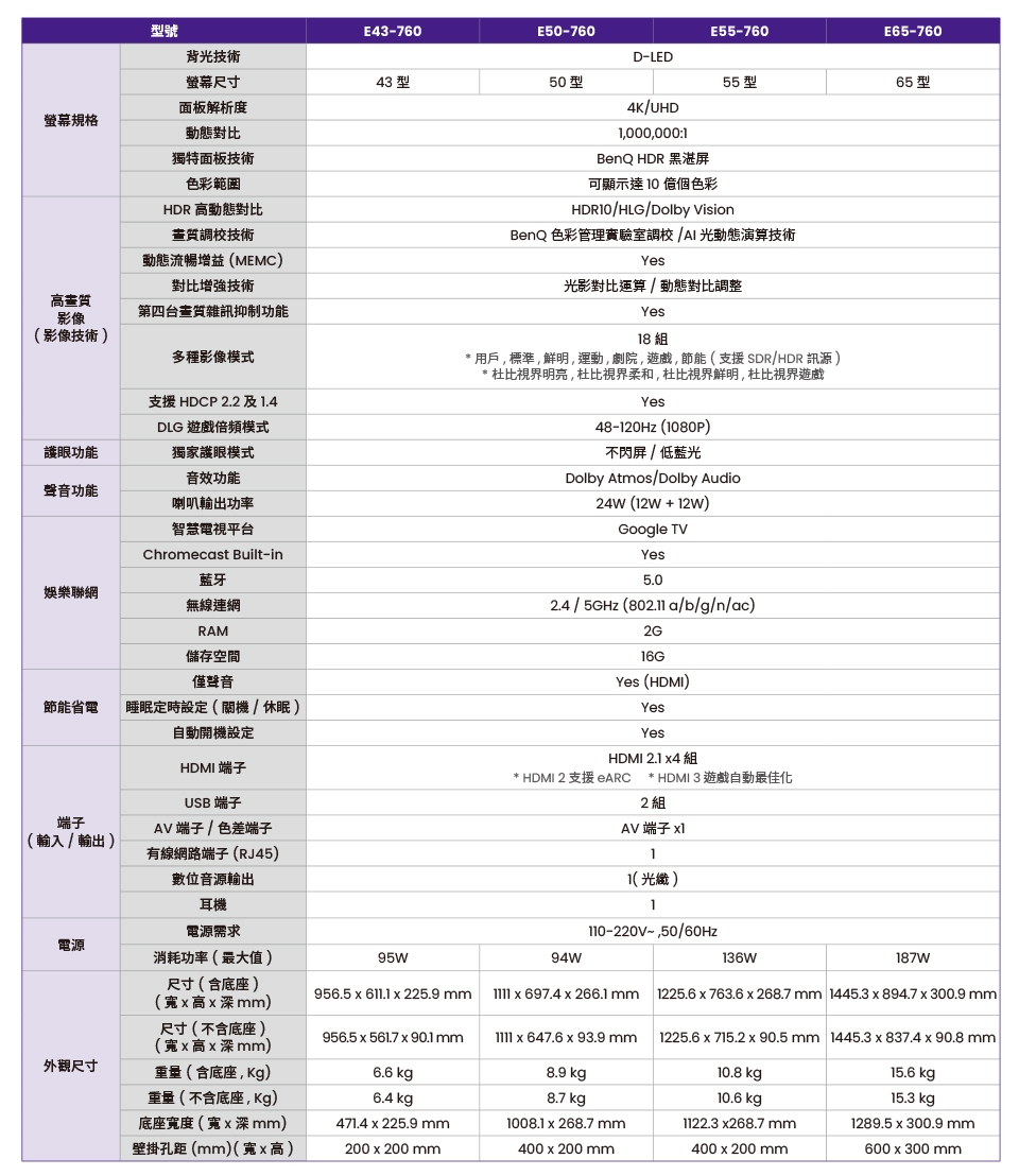 BenQ 43吋 4K量子點護眼Google TV QLED連網液晶顯示器(E43-760)