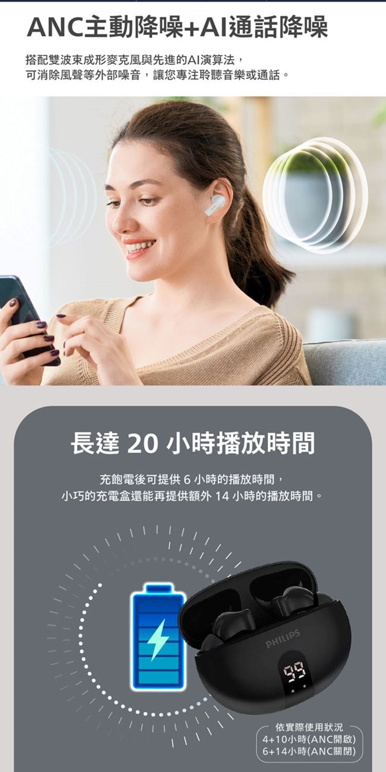 ◎ 使用時間:4 10小時(ANC開啟)6 14小時(ANC關閉)
